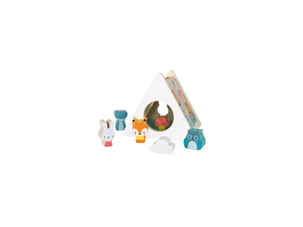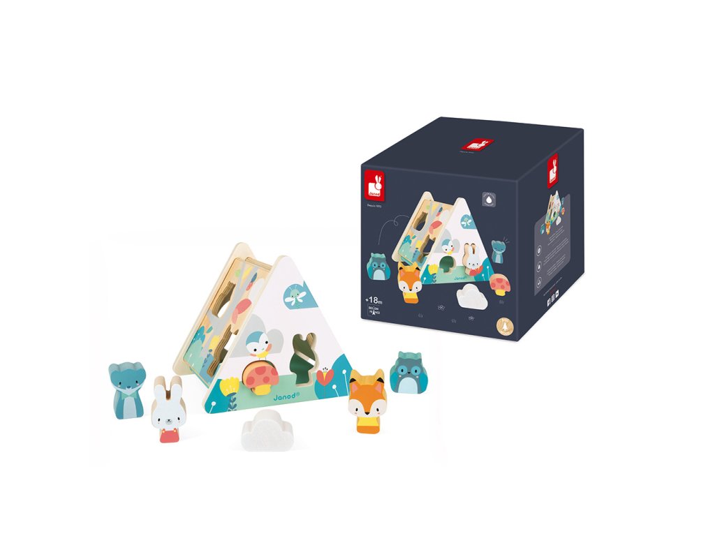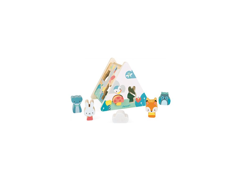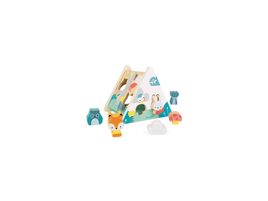 Csodálatos pasztell színű fa építőkocka ház 18 hónapos kortól. A beilleszthető tárgyak bájos négy állatka, gomba és felhő, gyönyörű pasztell színekkel, amelyek tetszeni fognak a gyerekeknek. A ház három oldalán két-két lyuk található a formák beillesztésére. A negyedik oldalon egy kerek, nagy lyuk található, amelyből a gyerekek ismét kivehetik a formákat. Ezzel a játékkal a gyerekek fejlesztik motoros készségeiket, kéz-szem koordinációjukat, és megismerik a formákat és színeket. Méret: 15,2 x 18,2 x 16 cm 18-36 hónapos gyermekek számára alkalmas