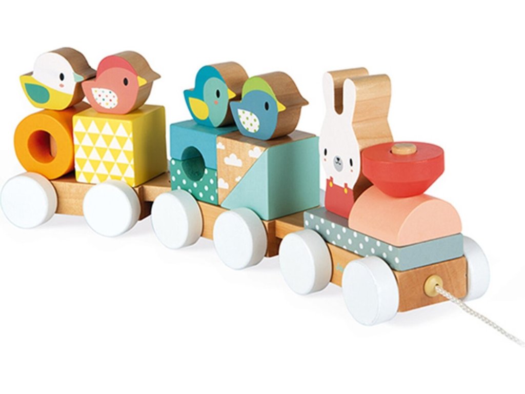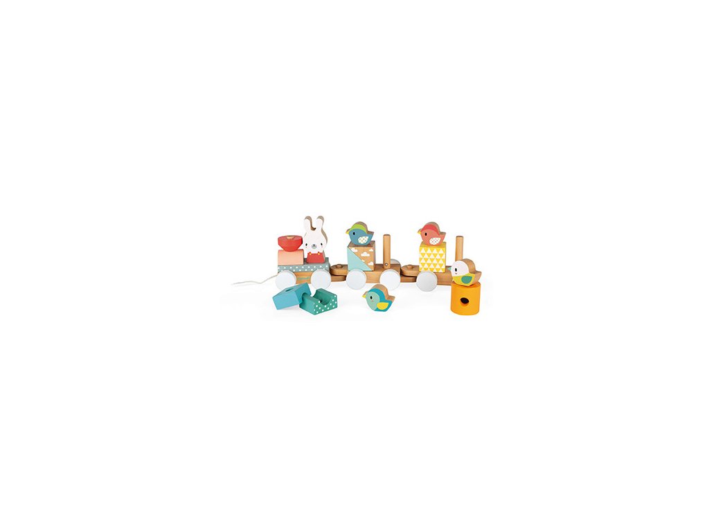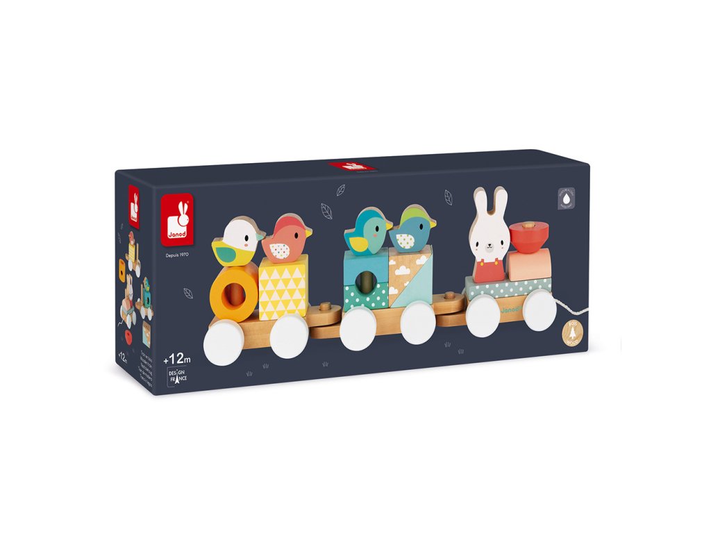 A Pure Janod fából készült húzható vonat egy csodálatos játék a 12 hónaposnál idősebb gyermekek számára. A vonatot saját elképzeléseik szerint rakhatják össze, mert minden része szétszedhető és máshová helyezhető. A vonaton van egy nagyobb nyuszi és kockák - vagonok, minden kockán egy aranyos színes madár ül. A gyerekek kicserélhetik a kockákat a vagonokon, saját belátásuk szerint rakhatják össze, kicserélhetik a madarakat, kisebb vagy nagyobb vonatot rakhatnak össze. Ez a vonat gyönyörű pasztellszíneivel és aranyos állataival nyűgözi le a gyerekeket. Ebben a játékban a gyerekek fejlesztik és tökéletesítik finommotoros készségeiket. Méret: 31,4 x 6,8 x 11,5 cm 12-36 hónapos kortól ajánlott