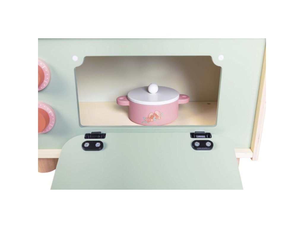 Itt az ideje enni, tehát itt az ideje bemenni a konyhába és finom ételt készíteni! A 3 évesnél idősebb gyermekek a fa játékkonyhájukkal őrült történeteket képzelhetnek el a tűzhely mellett, és utánozhatják a felnőtteket. Ez a játékkonyha, amely úgy van felszerelve, mint egy igazi, és 9 kiegészítővel rendelkezik, ideális a játékhoz és a legkülönfélébb receptek kitalálásához! A konyha méretét úgy tervezték, hogy bármilyen játéktérbe beférjen: 41,5 x 25 x 41,5 cm. Stílusát a nagymama konyhája ihlette, minden időtlen tárggyal, amelyet ma is szívesen megtalálunk: 2 vágódeszka, 1 serpenyő, 1 edény, 1 lyukas merőkanál, 1 merőkanál, 1 só- és borsszóró, például 1 cukortartó. A gyerekek az összes eszközzel előkészítik az alapanyagokat, megpárolják és fűszerezik őket. De ez még nem minden! A tűzhely továbbá sütővel van felszerelve, hangot adó forgatógombokkal és mágneses ajtókkal, mosogatóval, forgatógombokkal a csaphoz, sütőlapokkal, törülközőtartóval és órával. Ennek a fából készült konyhának a részletgazdagsága és kompakt méretei lenyűgözőek! Egy másik csúcspont a törésálló, innovatív sütőpánt, amelyet az egyszerű összeszereléshez terveztek. Már csak be kell menni a konyhába, és elkészíteni egy finom házi burgonyapürét vagy ropogós süteményt! Ez a kis gyermek konyha FSC™ tanúsítvánnyal rendelkező, fenntartható gazdálkodású erdőkből származó fából készült. A Shiny Grandma sorozatunk része: a nagymama konyhája által ihletett játékutánzatok készlete, átitatva érzelmekkel és gyermekkori emlékekkel.