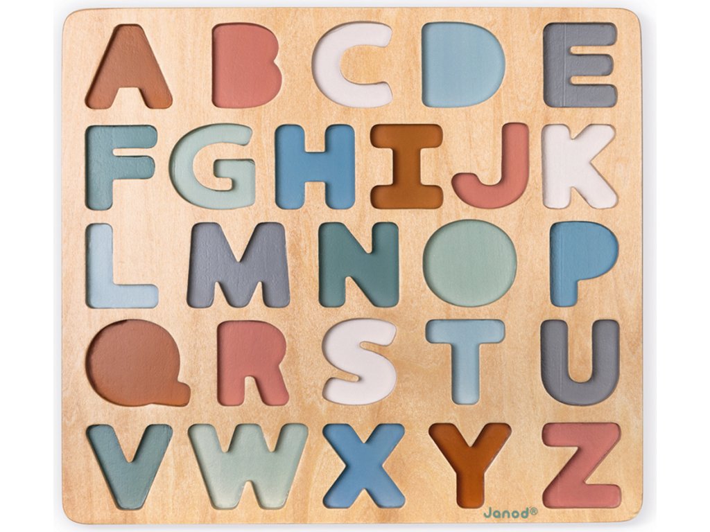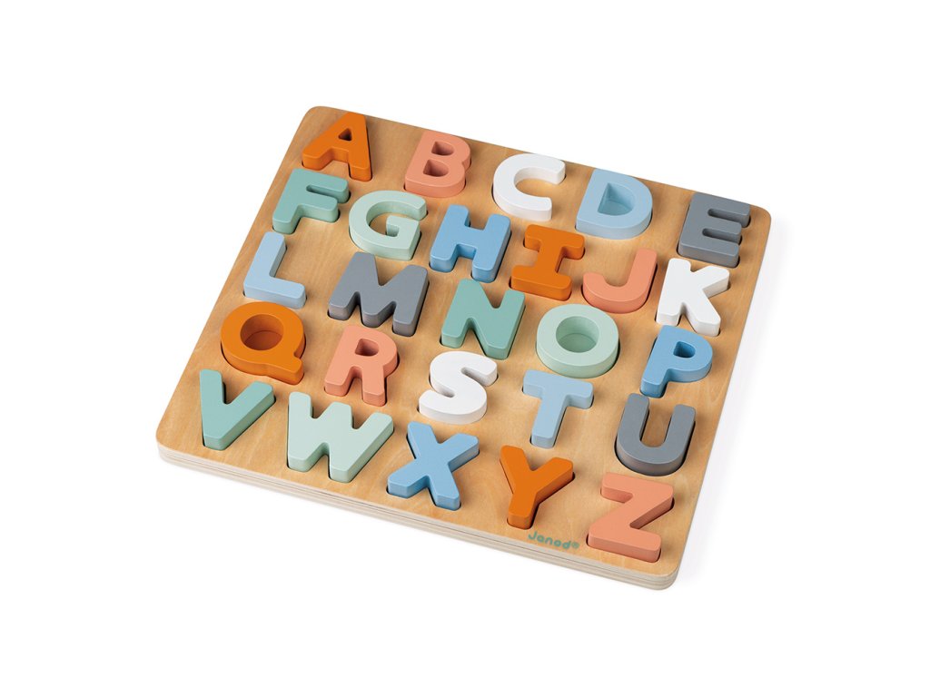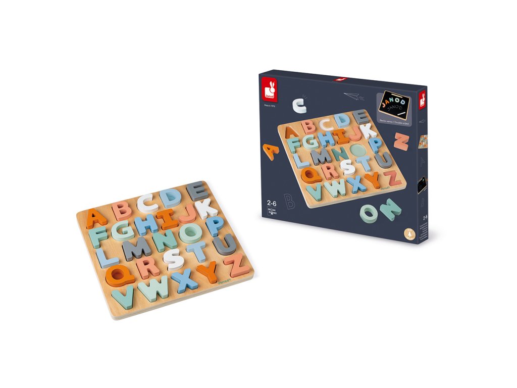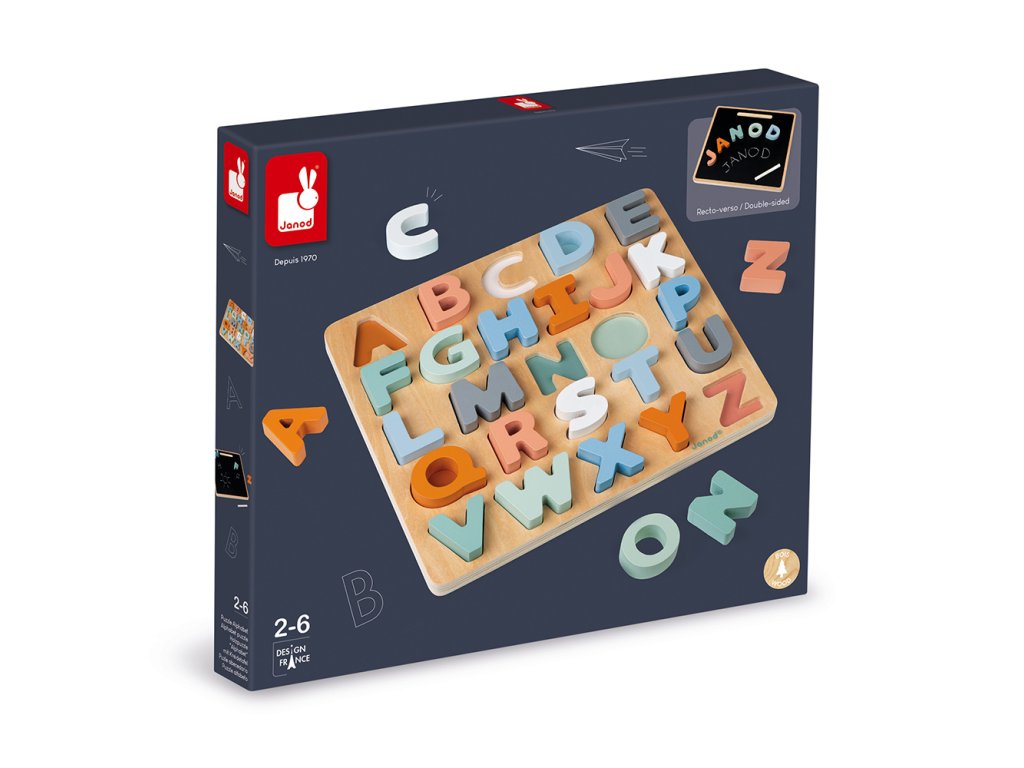 Janod Sweet Cocoon sorozatú fa betétes ábécé puzzle és írótábla.