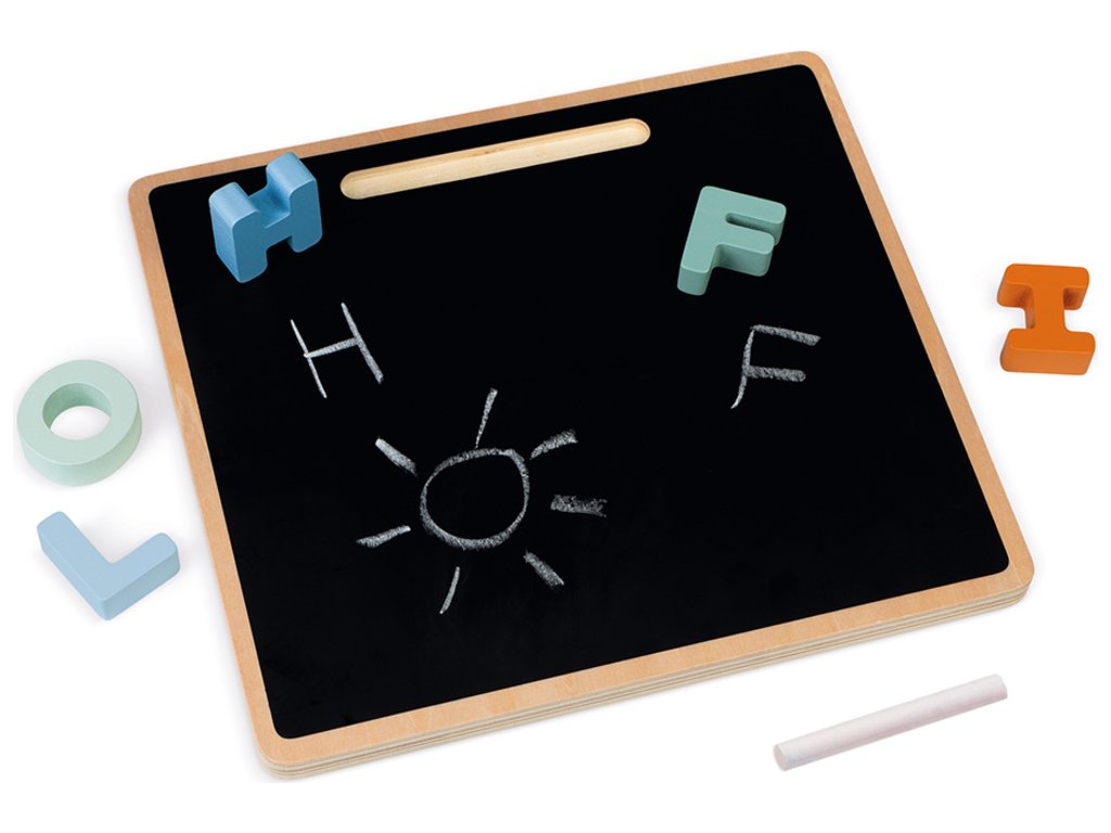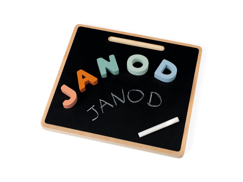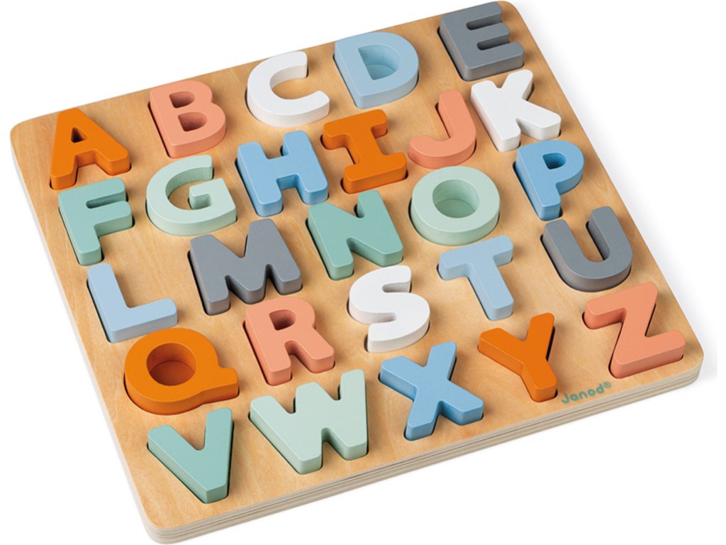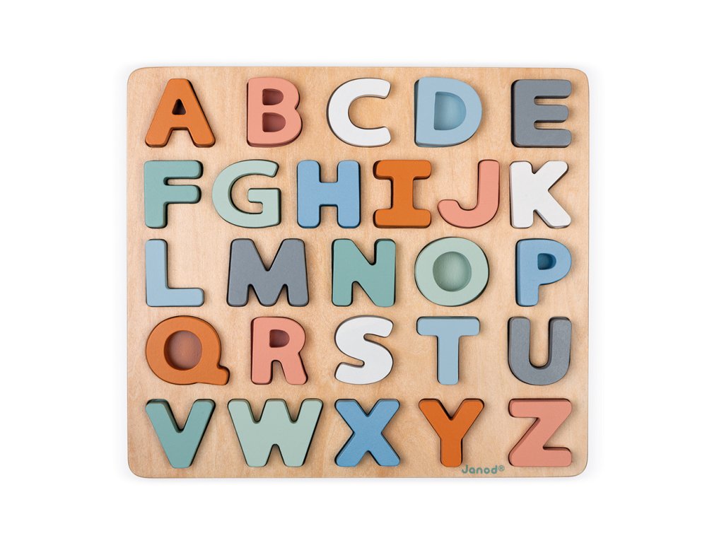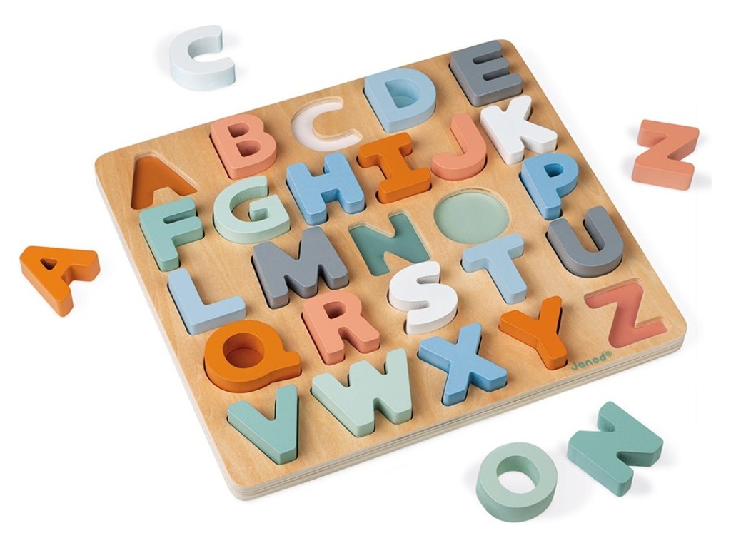 Janod Sweet Cocoon sorozatú fa betétes ábécé puzzle és írótábla.