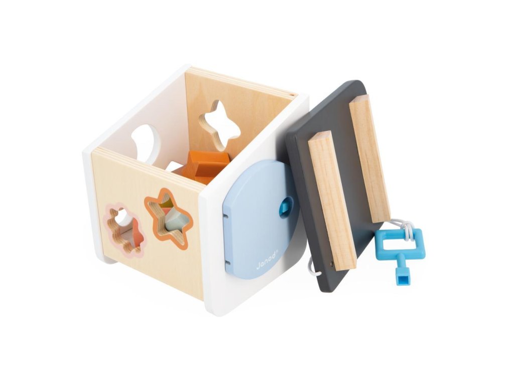 Formaválogató doboz kulccsal? Micsoda finomság! Ennek a korai játéknak egy másik előnye a ház alja, amely filccel van bélelve, ami tompítja a leeső darabok hangját. A puhaság a kulcsszó ennél a játéknál: természetes fa, filc, időtlen színek, imádnivaló madár stb.