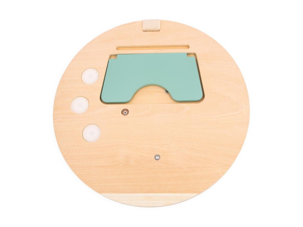 Ez a tábla nagyon praktikus, és alkalmazkodik a gyermek legkényelmesebb játékhelyzetéhez. A mozgatható talpnak köszönhetően a tevékenységi tábla 45°-os szögben állítható, hogy a gyermek könnyen játszhasson ülve vagy asztalnál. Állvány nélkül a tábla teljesen lapos, és a tetején található nagy tépőzár segítségével a falra vagy a járóka rudaira akasztható. Ez egy egyszerű, komplex játék finom színekben, amely segít gyermekének fejleszteni finommotoros készségeit és ügyességét.