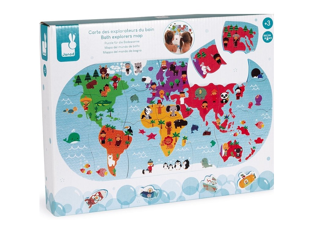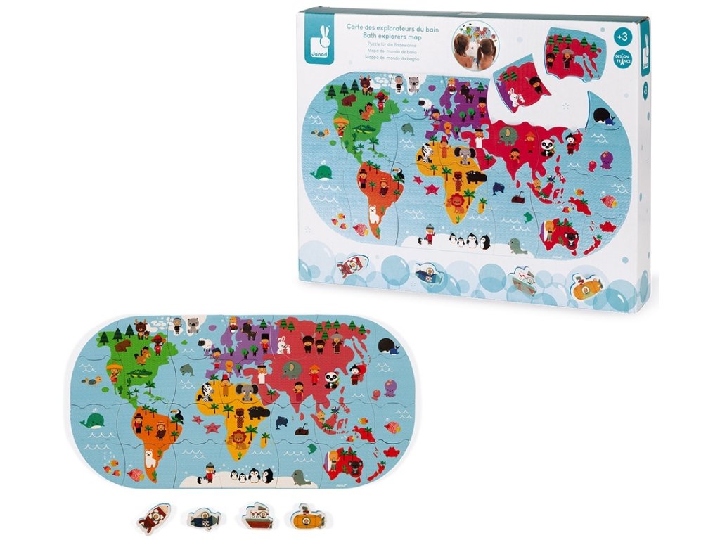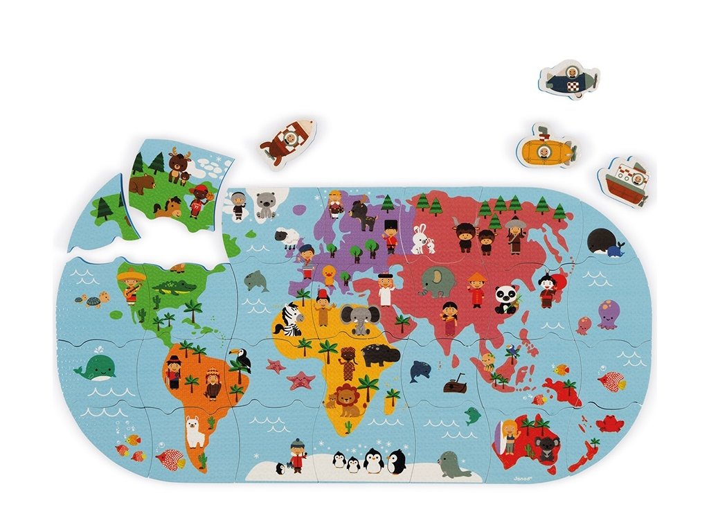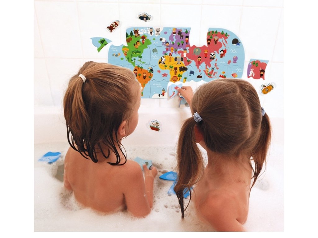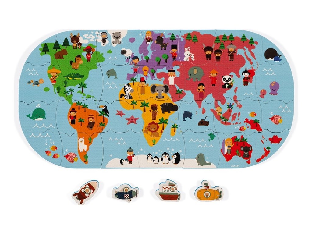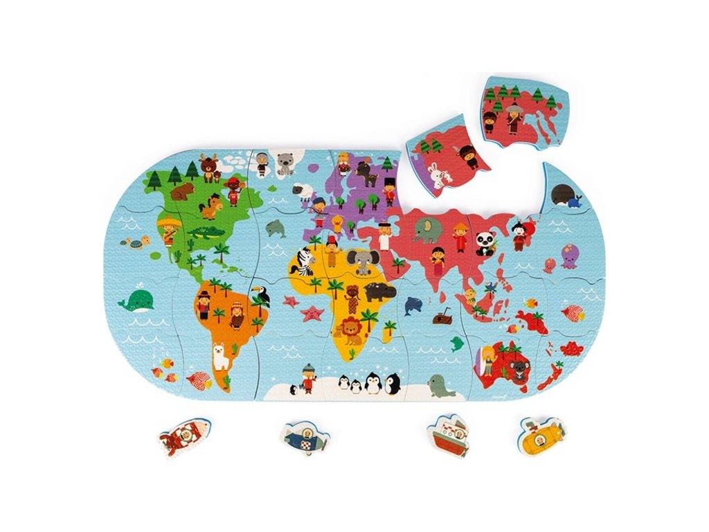 Puha műanyag puzzle Világtérkép, amely 3 éves kortól alkalmas szárazföldi és vízi játékra gyermekek számára.A csomag 28 puzzle darabot tartalmaz.
