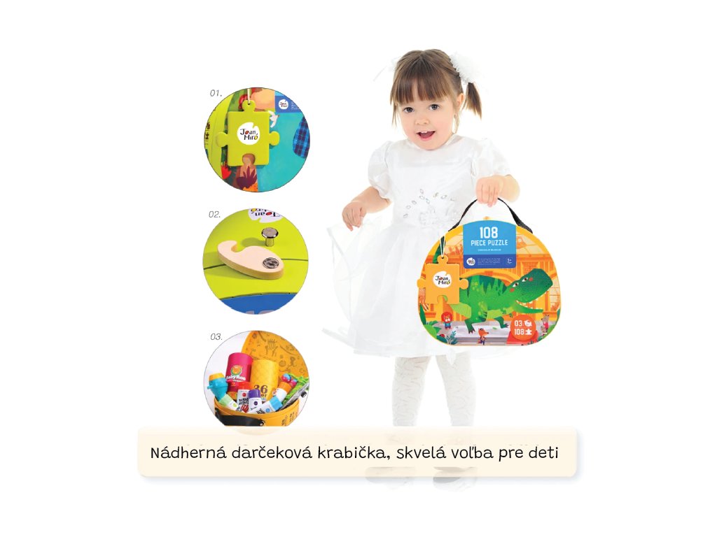Puzzle Dinoszaurusz Múzeum 108 db Próbáljátok meg kirakni a gyerekekkel a dinoszauruszok titokzatos világát Ezek a puzzle-k egy nagy képet kínálnak, amely 108 darabból áll, praktikus bőröndben tárolva. A kirakó befejezése után a gyerekeket egy vidám, színekkel és különféle dinoszauruszokkal teli múzeum várja. Ideális játék történetmeséléshez. Miért nagyszerű választás ez a puzzle a gyerekeknek? A 108 színes darab egy nagy múzeumi képet alkot – ideális 3 éves kortól. Fogantyús bőröndben szállítjuk, könnyen hordozható és összecsukható – nagyszerű otthoni használatra vagy szórakoztató tevékenységként utazáshoz. Erős karton darabok. A puzzle fejleszti a finommotorikát, a türelmet és a koncentrációt. Nagyszerű ajándék – nem igényel táblát vagy felületet