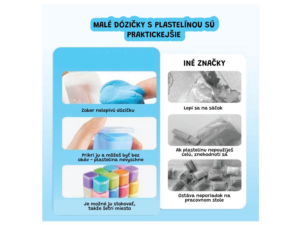 Gyurma kapszulákban 24 db. Kis kapszulák, nagyszerű ötletek – alkotás rendetlenség nélkül A Jarmelo gyurma praktikus mini kapszulákban érkezik, amelyek 24 színt tartalmaznak, melyek kombinálhatók egymással. Finom, rugalmas és nem ragad a gyerekek ujjaira. Ha azonban a gyurmát a levegőn hagyja, megkeményedik, és nem lehet tovább dolgozni vele. Ily módon azonban a gyerekek a puha alkotásokból valós, kemény figurákat vagy más műveket hozhatnak létre, amelyekkel aztán játszhatnak.Mit hoznak a kapszulák a gyerekszobába? Mini gyurma kapszulák – ideálisak az adagoláshoz és a tiszta kreativitáshozKellemes textúra, biztonságos és nem mérgező, 3 éves kortól alkalmas gyermekek számáraNagyszerű technológia, amely újrafelhasználhatóvá és puhává teszi a gyurmát, de ha a levegőn hagyja, megkeményedik és nem tér vissza eredeti állapotába.Támogatja az érzékszervi élményt, a finommotorikát és megkíméli a kezeket a rendetlenségtőlNagyszerű otthonra és utazáshoz is – a kapszulák tárolhatók és praktikusak