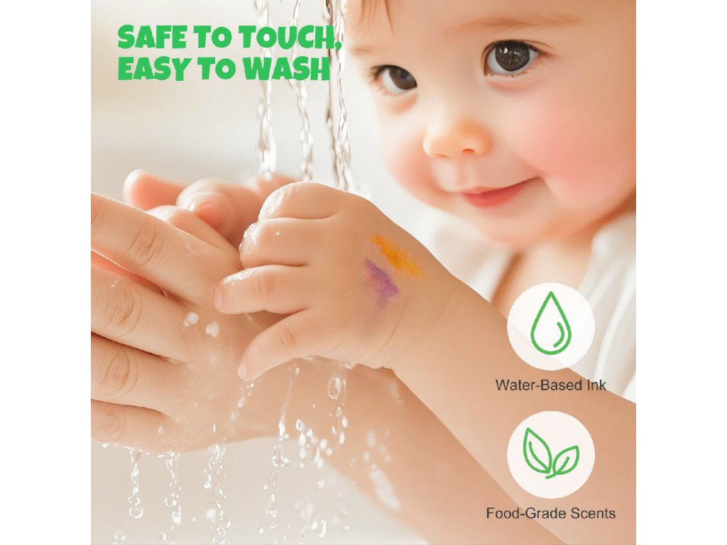 Mosható, illatos filctollak 12 dbIllatos, mosható filctollak gyerekeknek – Természetes gyümölcsös, cukorkás és növényi illatokTegyék illatossá a gyermekek rajzolását színekkel és fantáziával! A Jarmelo mosható, illatos filctollai nem csupán élénk színárnyalatokat kínálnak, hanem finom illatokat is, amelyek minden alkotást érzékszervi élménnyé varázsolnak. Minden filc más természetes aromát rejt, a gyümölcsöktől kezdve az édes finomságokon át a finom növényekig, így a rajzolás az ízlelőbimbókat is serkenti.Miért fogják a gyerekek imádni őket?12 élénk és ragyogó színFinom természetes illatok (gyümölcsös, édes, növényi)Nem mérgező és biztonságos gyermekek számáraKönnyen lemosható a bőrről és a legtöbb felületrőlErgonomikus forma, amely alkalmas a gyermekek kezéreA csomag tartalmazza az illatos tesztkártyákatRemek minden napraOtthoni alkotás, óvodák és iskolai művészeti tevékenységekA képzelet, a kreativitás és az érzékszervi észlelés fejlesztéseSzínezők, naplók, kreatív projektek és ajándékok
