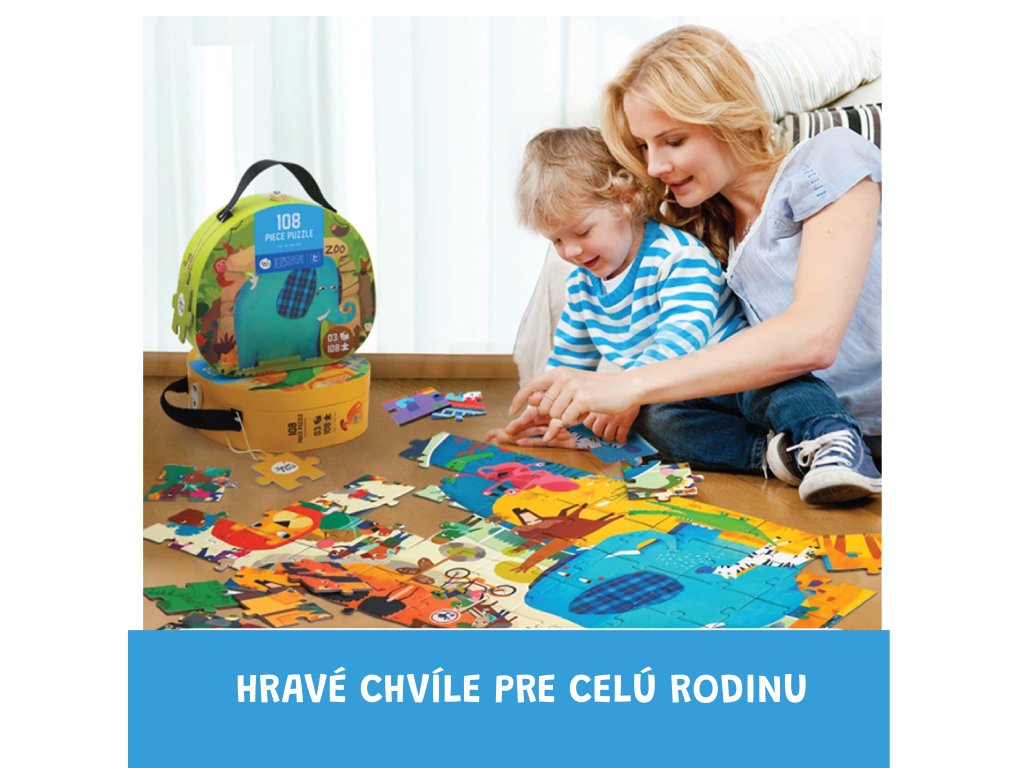 Puzzle Egy nap az Állatkertben 108 db Próbálja meg a gyerekekkel kirakni a színes Állatkertet – rakják ki, figyeljék meg, szórakozzanak! Ez a puzzle egy nagy, 108 darabból álló képet kínál, praktikus bőröndben tárolva. A kirakó befejezése után a gyerekeket egy vidám, színes világ várja, tele állatokkal, mint például zsiráf, elefánt, majmok vagy pandák. Ideális játék történetmeséléshez. Miért nagyszerű választás ez a puzzle a gyerekeknek? 108 színes darab egy nagy Állatkert képet alkot – ideális 3 éves kortól. Bőröndben szállítjuk fogantyúval, könnyen hordozható és összerakható - nagyszerű otthoni használatra vagy szórakoztató tevékenységként utazáshoz. Erős karton darabok. A puzzle fejleszti a finommotorikát, a türelmet és a koncentrációt. Nagyszerű ajándék – nem igényel táblát vagy felületet