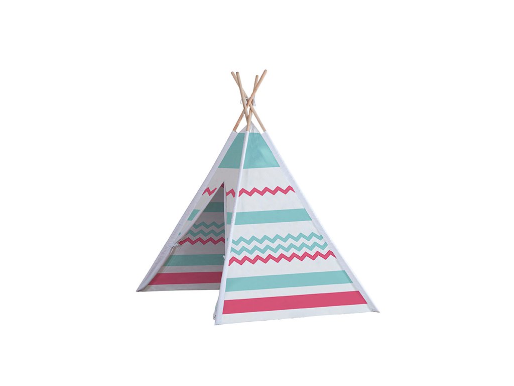 A színes kivitelű teepee ideális menedék a kis indiánok vagy plüss barátok számára. Tágas, retró megjelenésű teepee, mind a négy oldalán nyomtatással és zárható bejárattal. Az összeállított teepee mérete 120 x 120 x 160 cm.