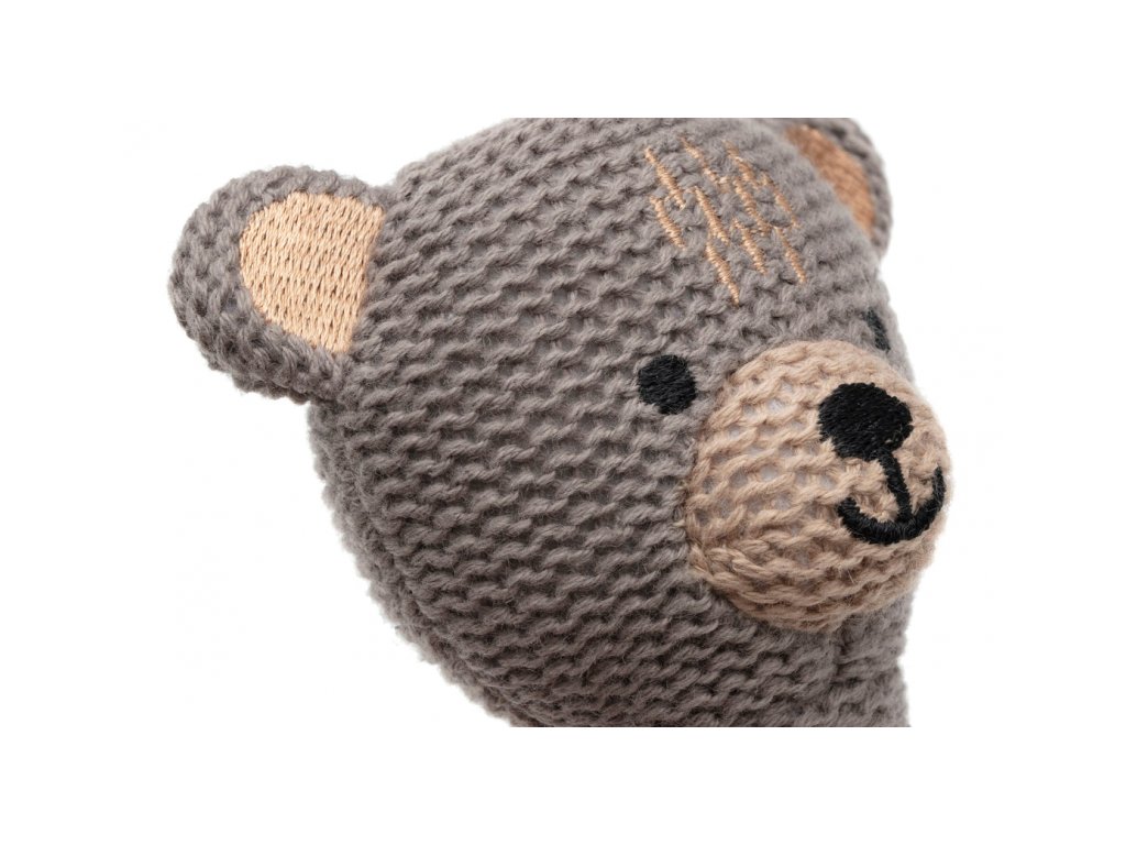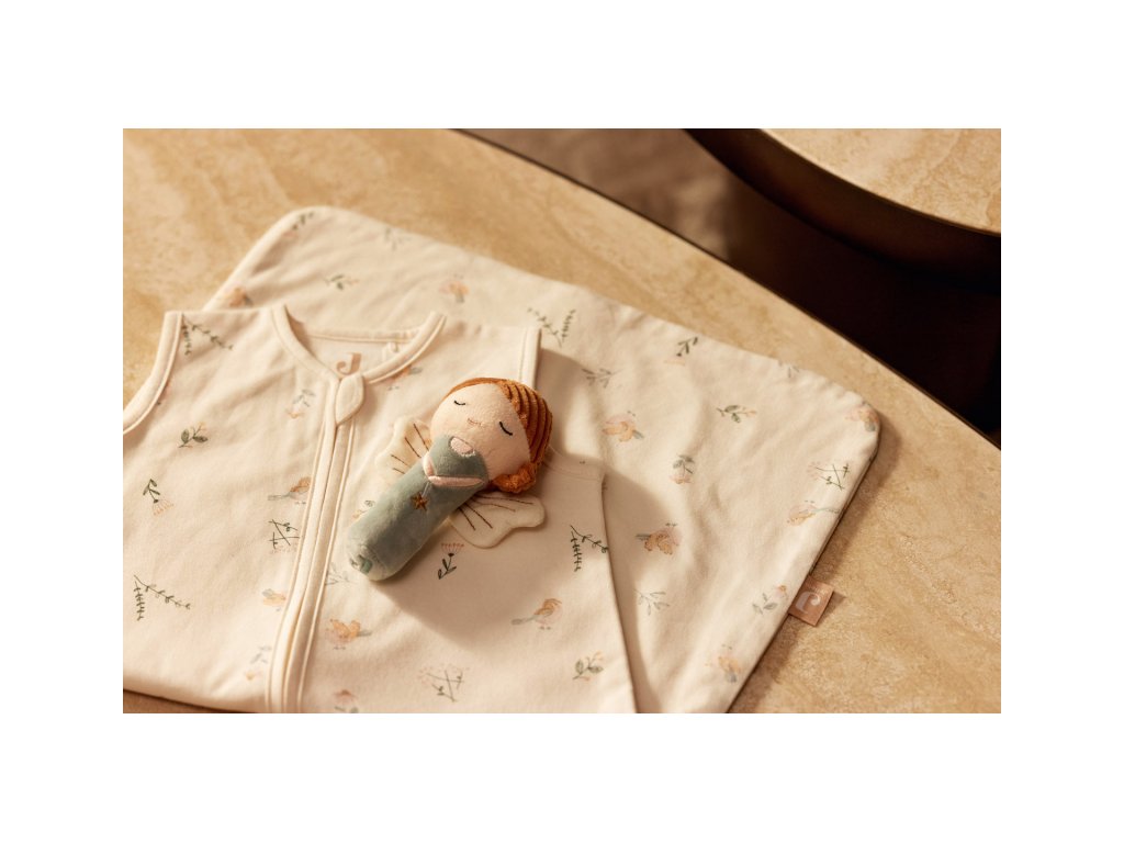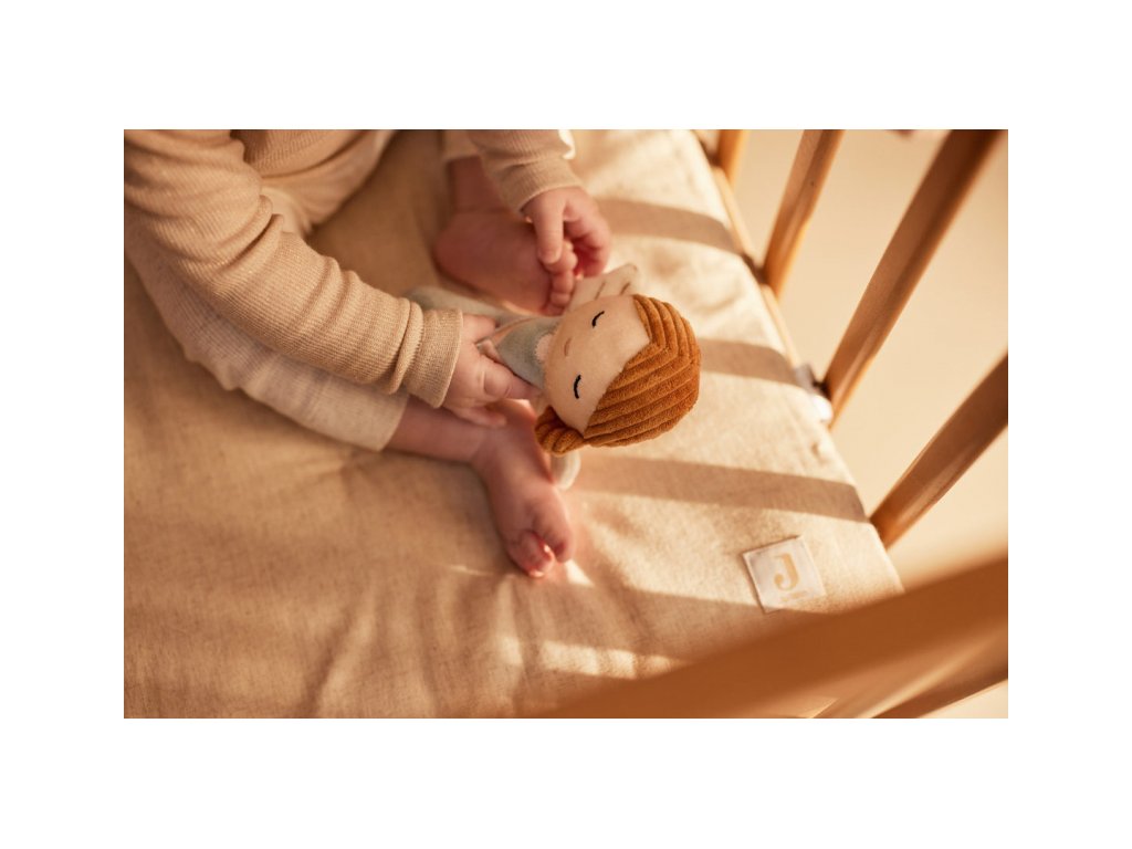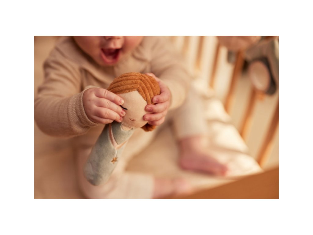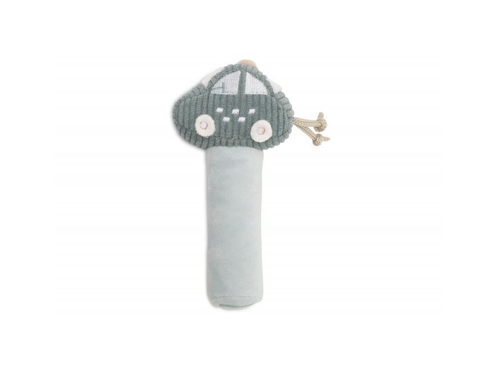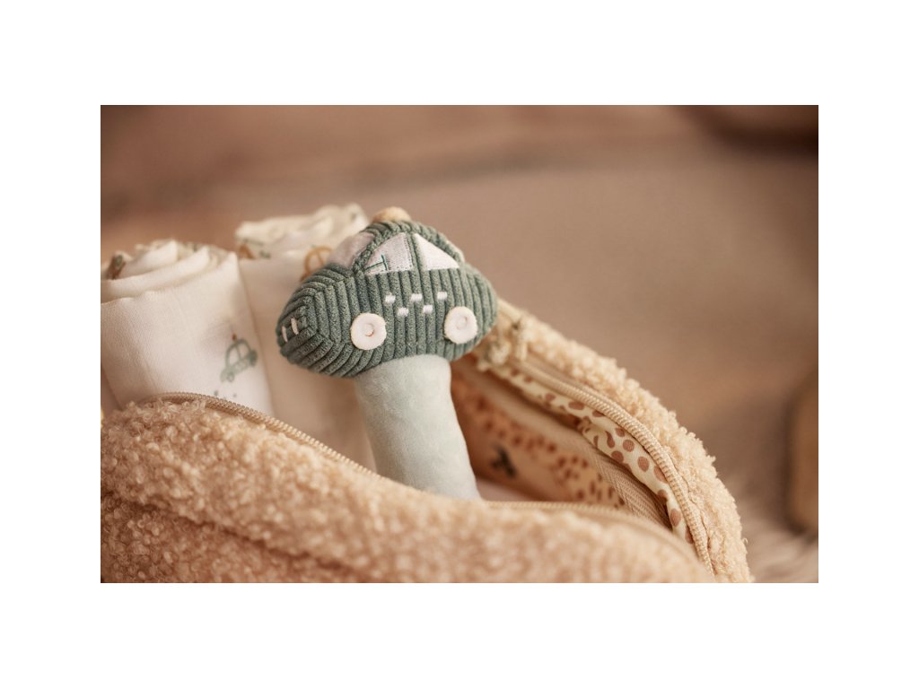 A puha textil anyagból készült kisautó formájú csörgő formája könnyen megfogható, és finoman zörög, amikor mozgatják.
