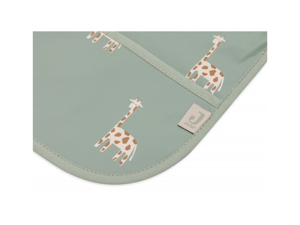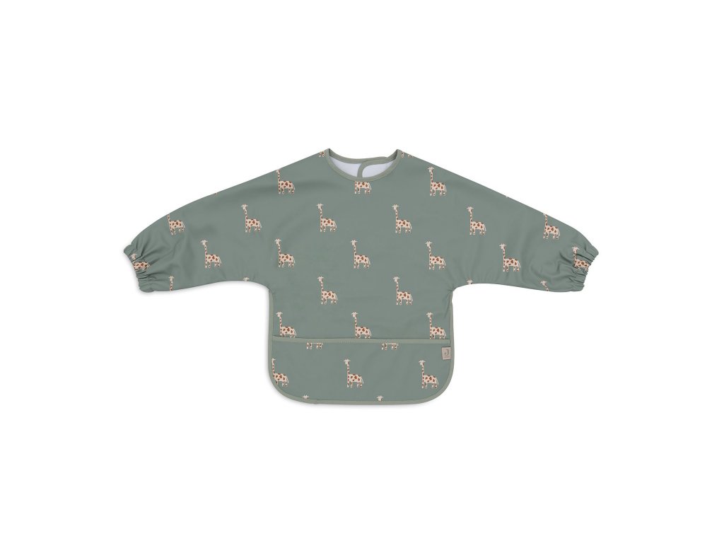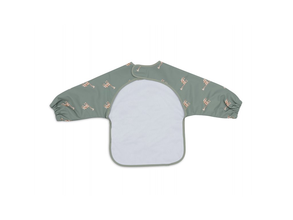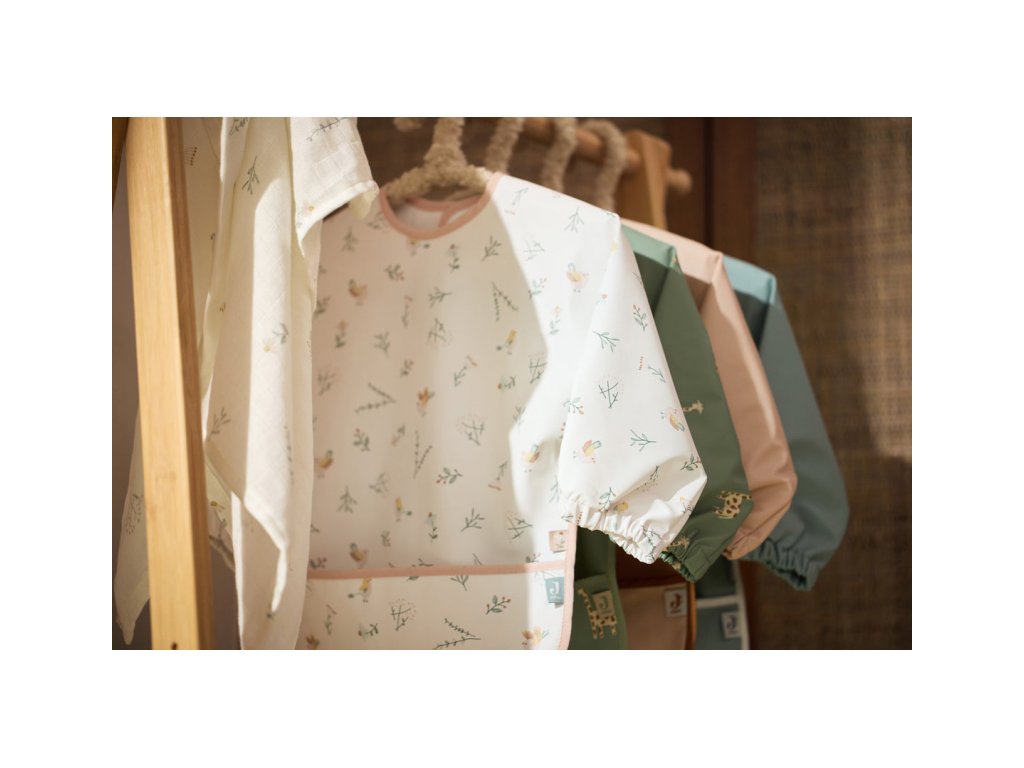 A vízálló, ujjú előke finom műanyagból készült, gyönyörű nyomattal, és zsebbel van ellátva a cseppek és morzsák felfogására. A nyak mögötti tépőzáras rögzítés megkönnyíti az előke felhelyezését.