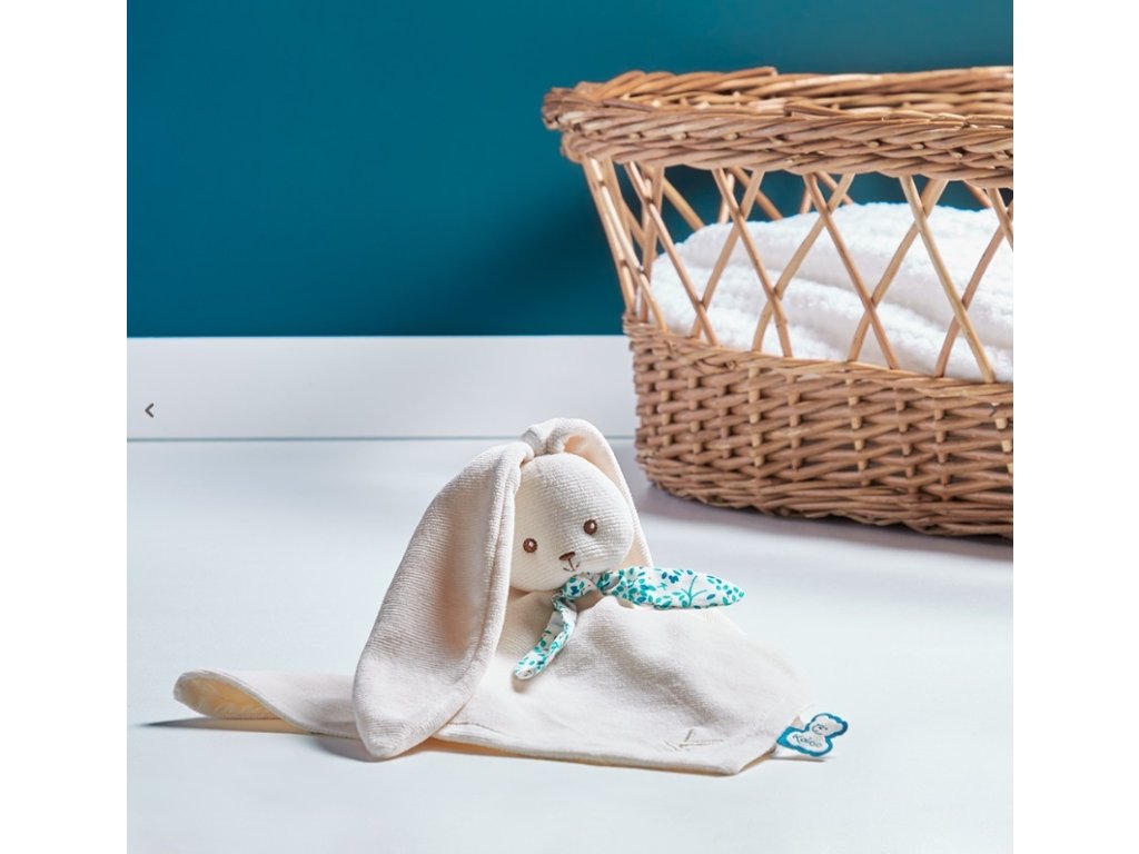 A Lapinoo sorozatból származó, krémszínű, vidám babatakaró tökéletes társ lesz babája számára. Kétféle anyagból, kordbársonyból és könnyű pamutszövetből készült, tökéletesen illeszkedik a baba finom kis kezeihez. Egyszerű és finom stílusa van. A feje alatt lévő gyönyörű virágos kendő elegáns megjelenést kölcsönöz neki.
