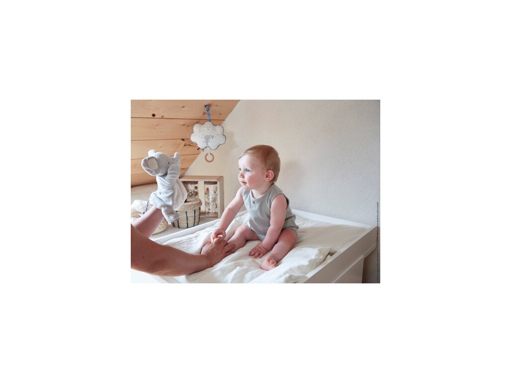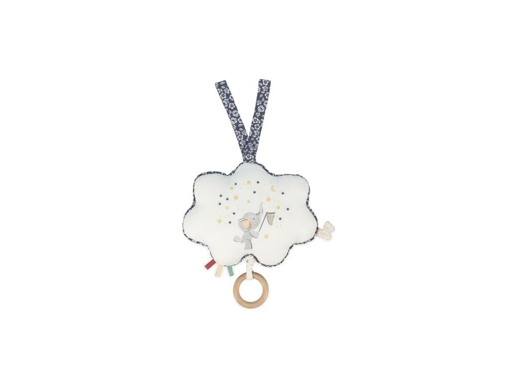 A zenélő felhőcske finoman nyomott és hímzett elefánt és csillag mintával, a párna kulcsfontosságú elem a baba fejlődéséhez.