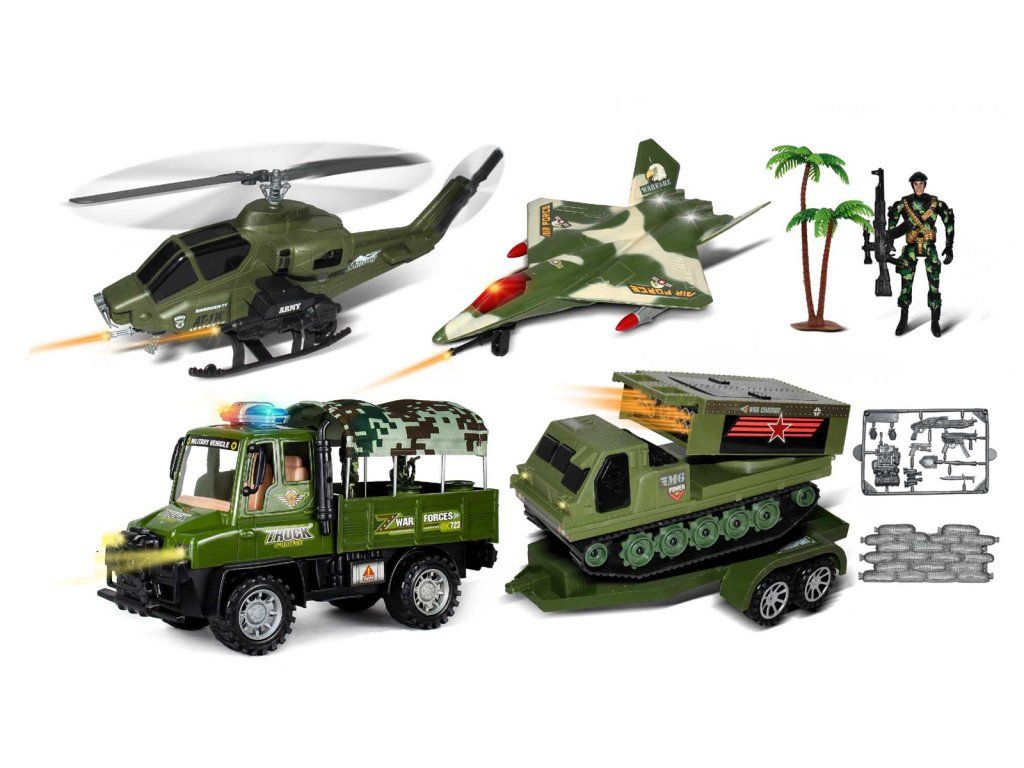 Katonai autó utánfutóval szett. Az autó mérete utánfutóval 63cm. A készlet tartalmaz autót, utánfutót, rakétavetőt, vadászgépet, helikoptert, katonafigurát és kiegészítőket. Életkor: 3+