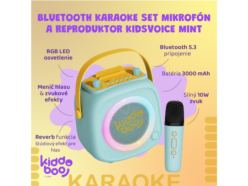 Bluetooth Karaoke szett mikrofon és hangszóró KidsVoice Mint Énekelj és szórakozz bárhol és bármikor Készen állsz egy gyerekkaraoke show-ra közvetlenül a nappaliban? A Kiddoboo Bluetooth Karaoke szett mikrofon és hangszóró KidsVoice Mint egy vezeték nélküli karaoke hangszóró és mikrofon egyben – gyerekeknek tervezve, akik szeretik a zenét, az éneklést és a showtime-ot! A tiszta hangtól a fényeffektusokig ez a stílusos zöld segítő minden szobát színpaddá varázsol.Melódiák, amelyek feldobják a napot RGB LED világítás – színes party hangulatot teremt Erős 10W-os hang – a tiszta és szórakoztató zenei élményért Reverb funkció – professzionális stúdió effektus a hanghoz Hangváltó & hangeffektusok – szórakozás minden hangban Szabadság és kényelem a kis énekeseknek Vezeték nélküli mikrofon – énekelj kábelek és korlátozások nélkül 3000 mAh akkumulátor – hosszú üzemidő a végtelen előadásokhoz Bluetooth 5.3 – stabil kapcsolat akár 10 méteres hatótávolsággal 3 éves kortól alkalmas – biztonságos és egyszerű kezelés A Kiddoboo KidsVoice Mint ideális ajándék a kis zeneszeretőknek – ötvözi a kreativitást, a mozgást és a szórakozást egy színes show-ban. A gyerekek szórakoznak, megtanulnak bánni a hangjukkal, és úgy ragyognak, mint a csillagok!