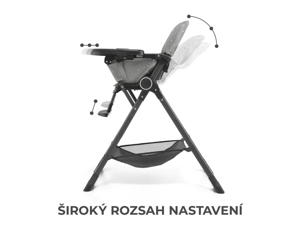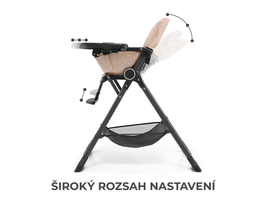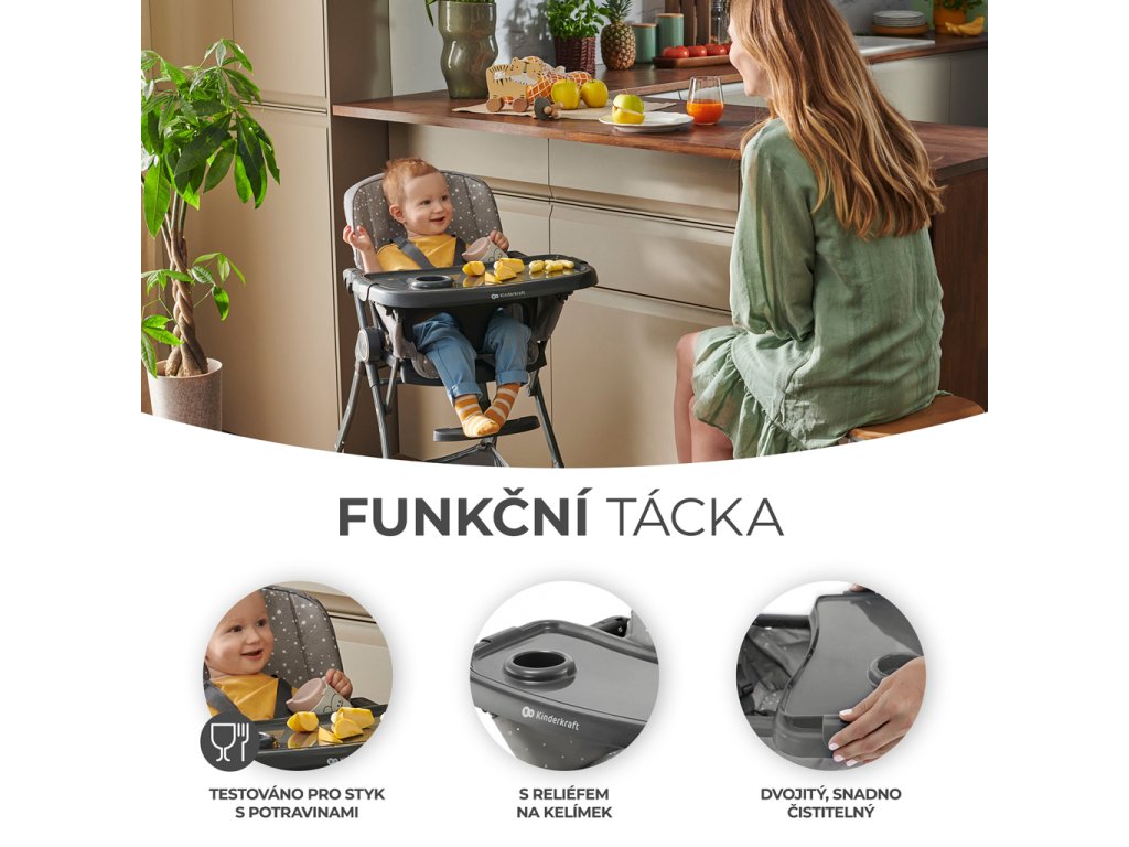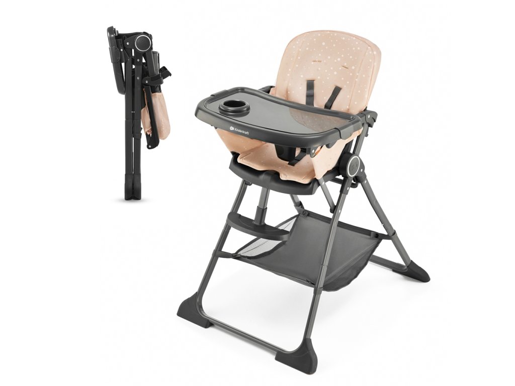 A FOLDEE kompakt méretűre összecsukható, ami lehetővé teszi a könnyű szállítást, például nyaralásra. Széles beállítási tartománnyal rendelkezik, amely lehetővé teszi a szék gyermek magasságához igazítását. 3 háttámla- és 2 lábtartó pozícióval rendelkezik, így nemcsak kényelmet biztosít gyermeke számára, hanem lehetővé teszi a helyes testtartás felvételét is evés közben. A kényelmesebb étkezés érdekében a tálca 3 tartományban állítható az üléstől.