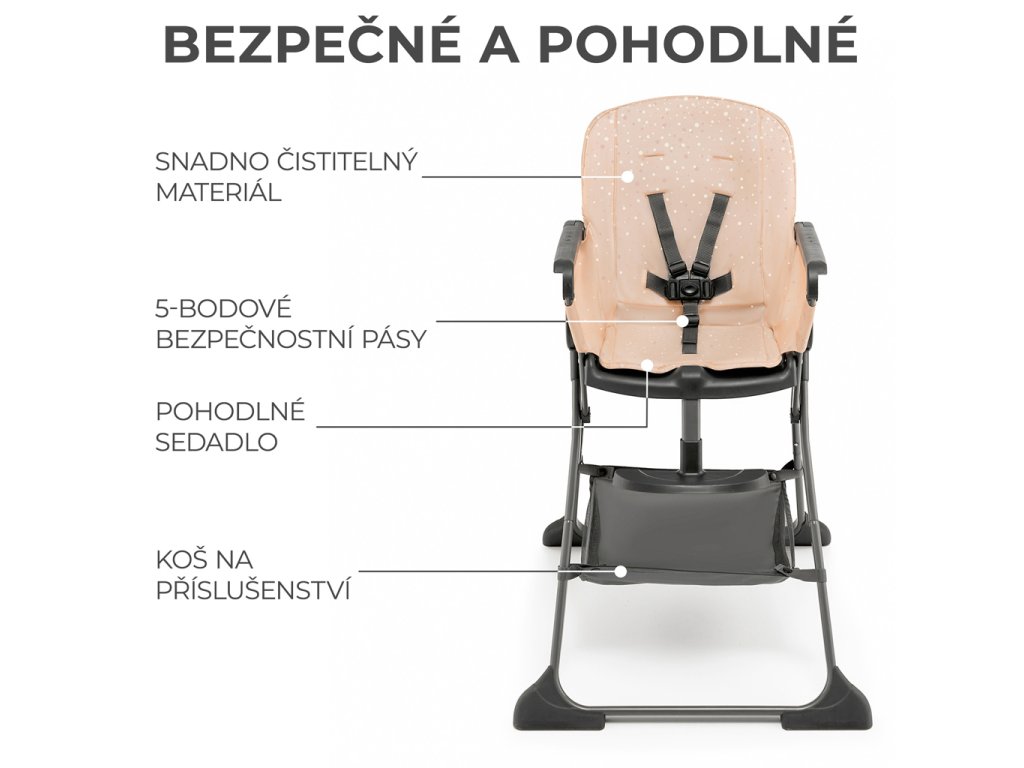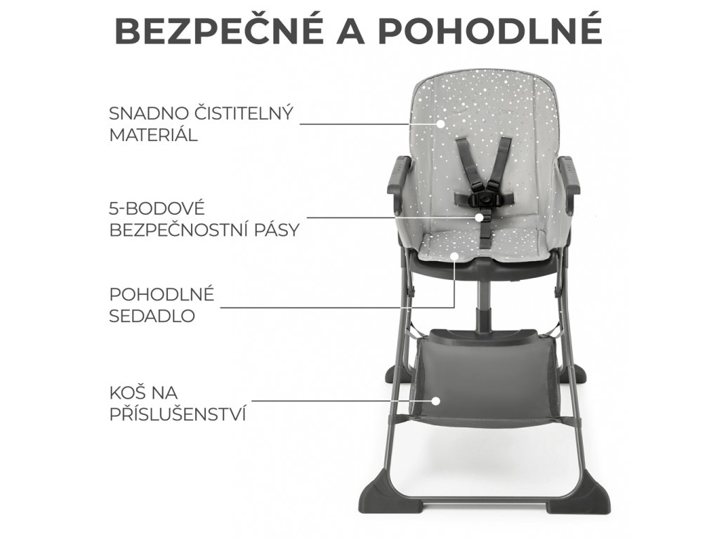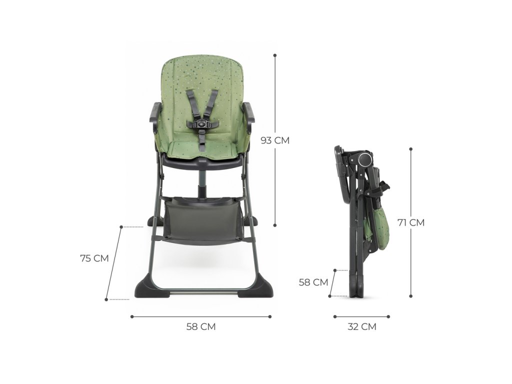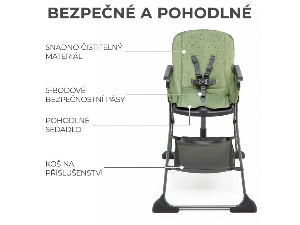 A FOLDEE nagyméretű üléssel rendelkezik, amely könnyen tisztítható anyagból készült. Könnyen eltávolíthatja róla a legmakacsabb ételfoltokat is. A szék biztonságos: 5 pontos, állítható övekkel rendelkezik, amelyek szükség esetén eltávolíthatók és kimoshatók. Az ülés alatt egy kosár található apró tárgyak számára, például nedves törlőkendők vagy egy tartalék előke.