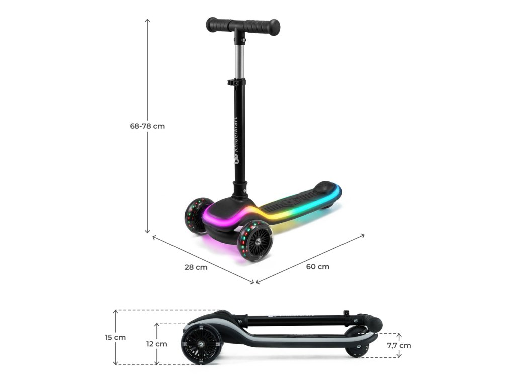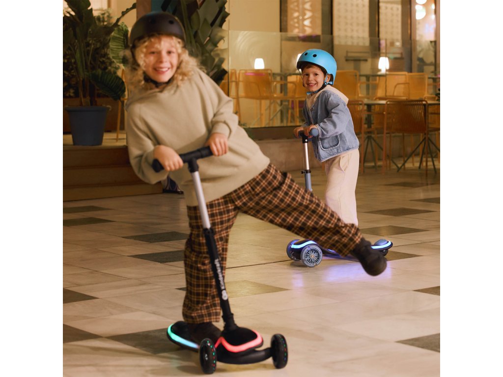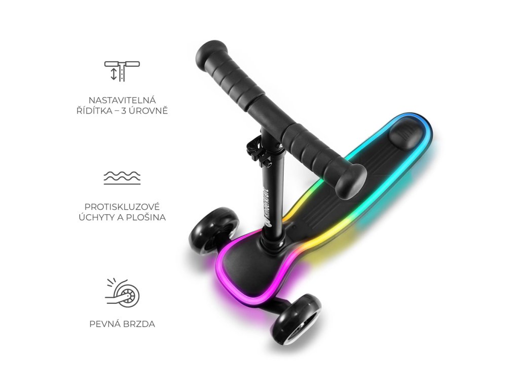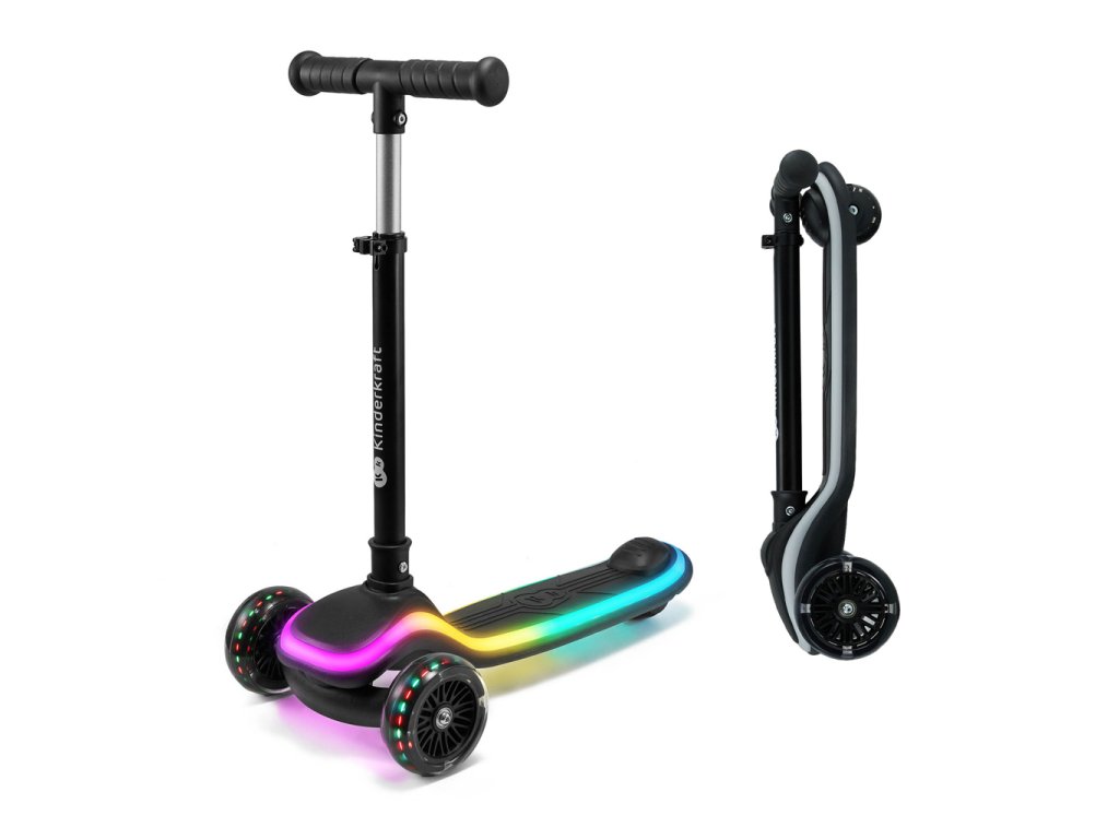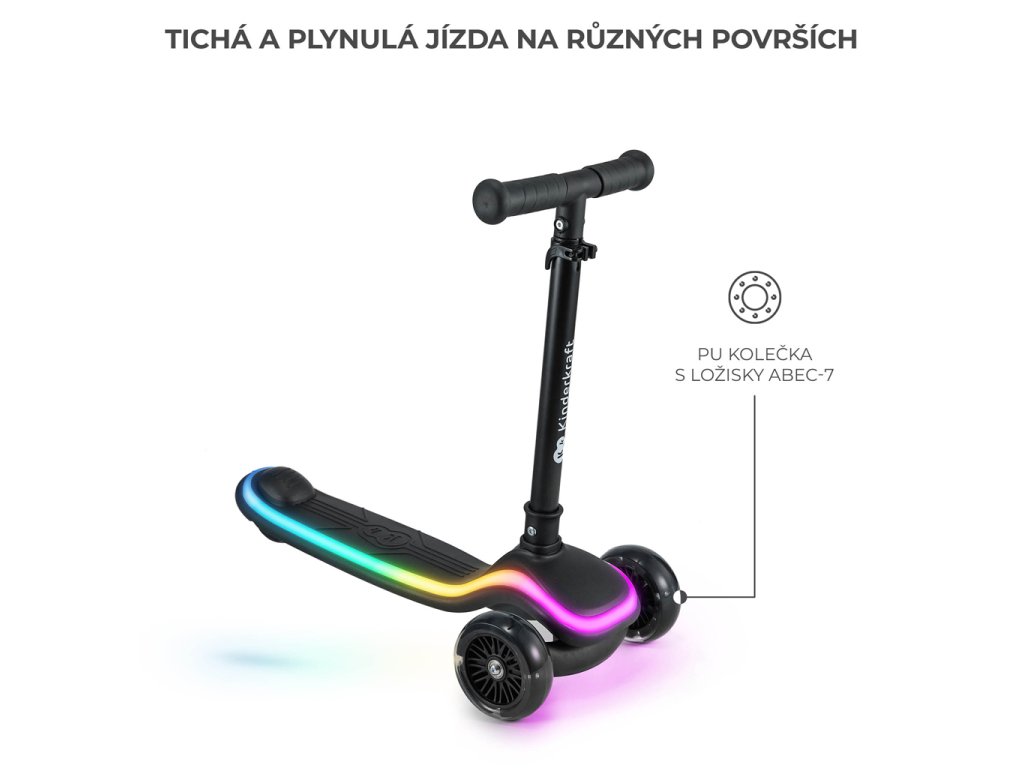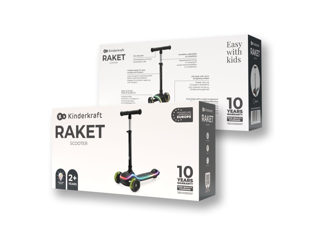 Szórakozás és biztonság egész nap. A RAKET egy gyermek roller intuitív testdőléssel történő irányítással, amely támogatja az egyensúly és a koordináció fejlődését. A világító LED platformnak és az RGB kerekeknek köszönhetően a rollerezés nemcsak izgalmas, hanem biztonságosabb is szürkület után. A roller ideális az első rollerezési élményekhez – egyszerű összecsukással, állítható kormány magassággal és sima rollerezéssel minden felületen.