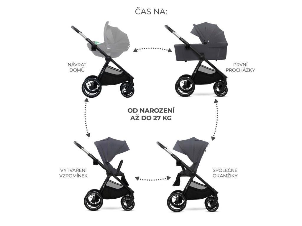 - Születéstől 22 kg-ig – a babakocsi nagy mózeskosárral és puha matraccal rendelkezik, amelyet a gyermek 9 kg-ig vagy addig használhat, amíg át nem fordul. A babakocsi ülése előre vagy hátrafelé is felszerelhető a menetiránynak megfelelően.