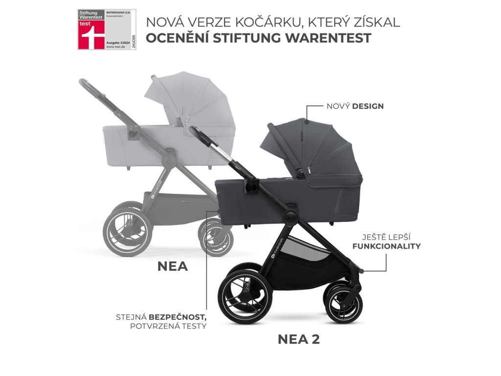 Ez a NEA 2 – egy multifunkcionális 2 az 1-ben babakocsi, amely kompakt kialakításával és minden terepre alkalmas kerekeivel kelti fel az érdeklődését. A nagy kerekek lehetővé teszik, hogy nagyobb probléma nélkül leküzdje a magas járdaszegélyeket vagy az egyenetlen városi járdákat. A NEA 2 válasz a modern szülők igényeire, akik stabil, erős, mégis jól irányítható babakocsit keresnek. A tetőn lévő ablak lehetővé teszi, hogy könnyen ellenőrizze, hogy a kisgyermek elaludt-e a séta során, és ha véletlenül a gyermek bepiszkolja a babakocsit, a mosható huzatot könnyen leveheti. A STOP & RIDE fék lehetővé teszi a babakocsi könnyű rögzítését és kioldását, az egyszerű összecsukható rendszer és a praktikus megoldások, mint például a SELF STANDING vagy az AUTO LOCK megkönnyítik a szállítást és a tárolást.