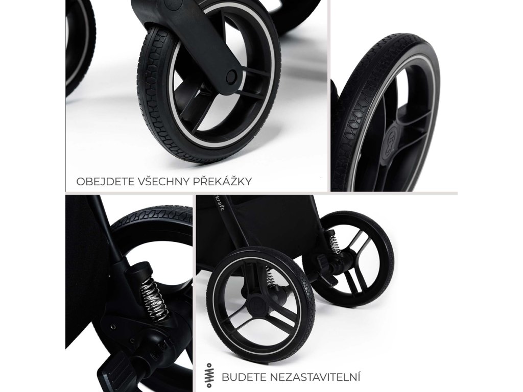 - A nagy, lengéscsillapítóval ellátott kerekek lehetővé teszik a babakocsi könnyű felemelését, és nem igényelnek pumpálást.