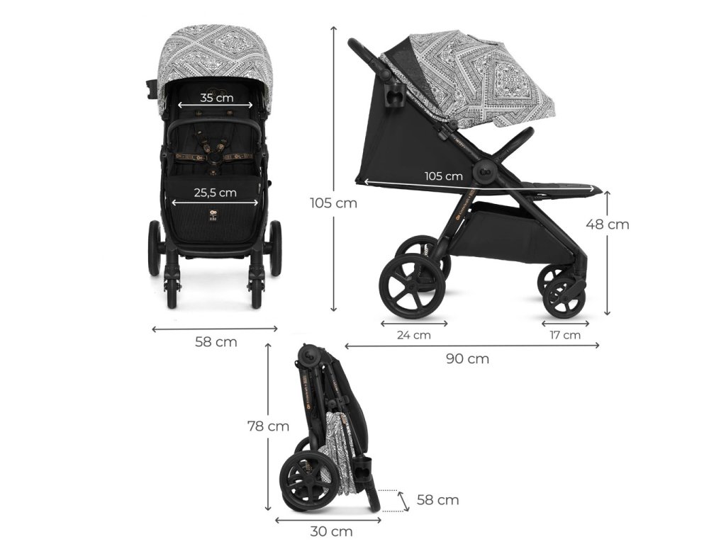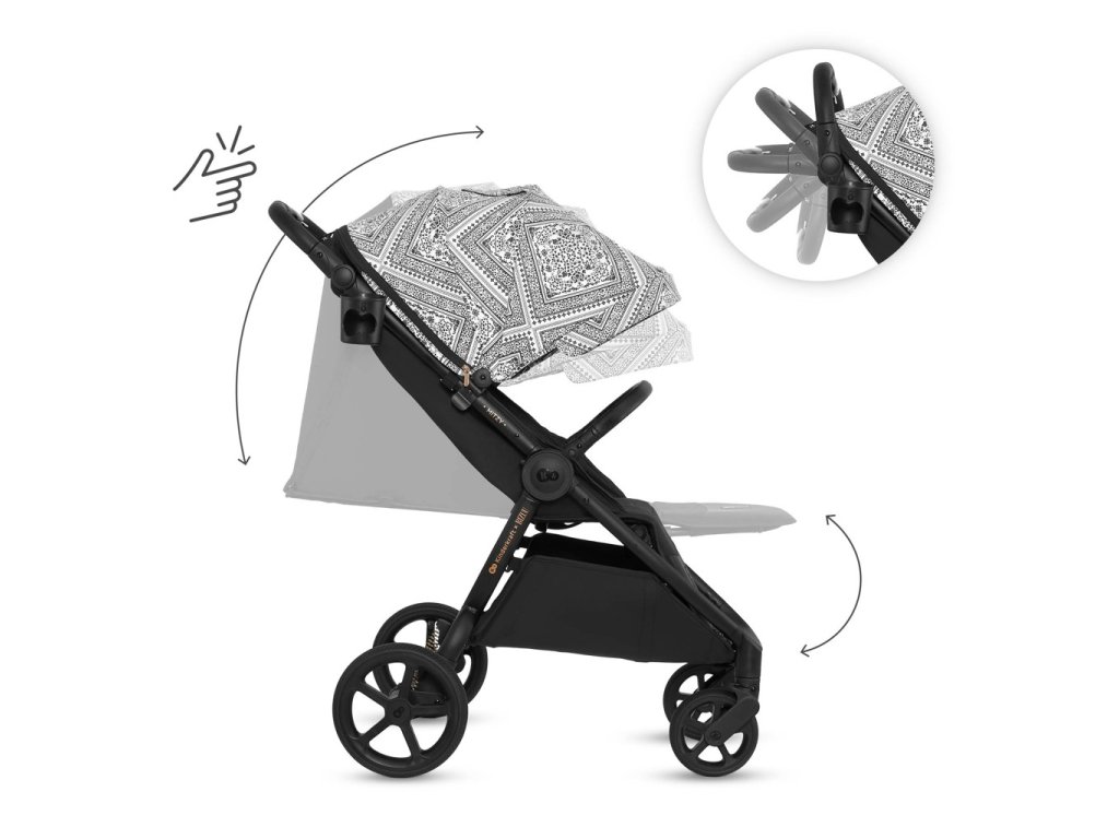 A MITZY egy pillanat alatt, egy kézzel kompakt méretűre összecsukható, és magával vihető az utazásokra. Esőben és hőségben is helytáll: a nagy, vízálló, UPF50+ kupola véd az esőtől, a széltől és az UV sugárzástól. A kupolán szellőzőpanel és ablak található a gyermekkel való kapcsolattartáshoz, és ha a háttámlát vízszintes helyzetbe állítja, rögzítheti az anyagot úgy, hogy gyermeke alvás közben elegendő levegőhöz jusson. A babakocsihoz tartozik egy behúzható szúnyogháló, amely a lábtartóban tárolható, valamint egy pohártartó. A MITZY mindent tartalmaz, ami a sétákhoz és a nyaraláshoz szükséges.
