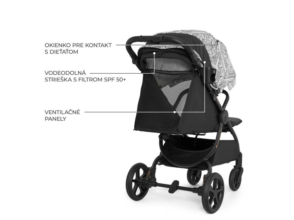 A MITZY megvédi gyermekét a séta során - a nagy, vízálló kupola UPF50+ szűrővel rendelkezik, amely még jobban védi gyermekét az UV sugárzástól. Szellőzőpanellel rendelkezik a hőségben való szellőzéshez és ablakkal a gyermekkel való kapcsolattartáshoz. Szél, eső - ez sem jelent problémát ennek a babakocsinak.