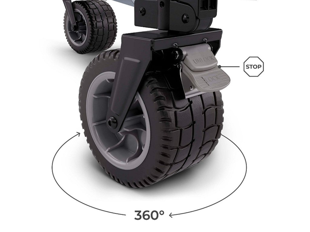 - Terepkerekek – a nagy PVC kerekek (10 cm szélesek) megbirkóznak a homokkal, a fűvel és a kaviccsal is