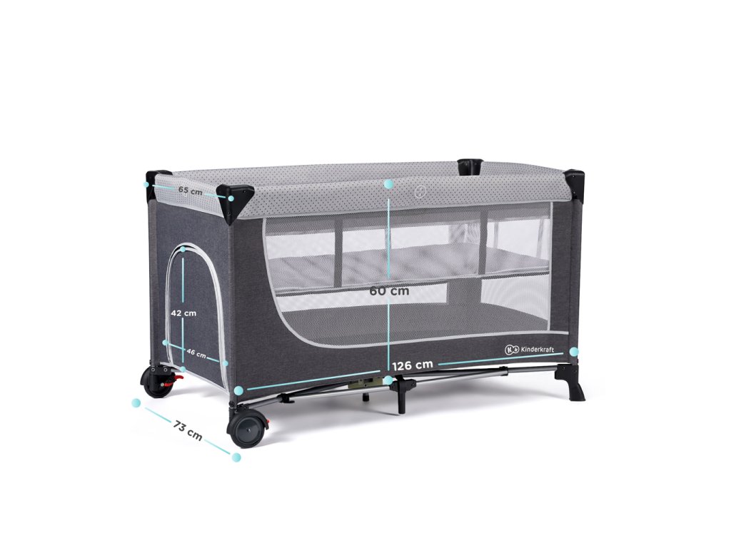 - A kiságy padlója 120 x 60 cm-es alvófelülettel rendelkezik. Garantálja a kellő helyet a pihenéshez, és klasszikus méretű matrac és ágynemű is vásárolható hozzá.