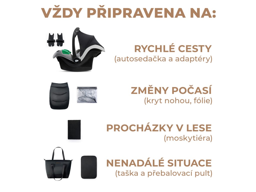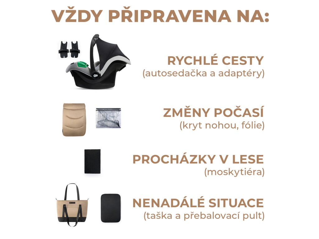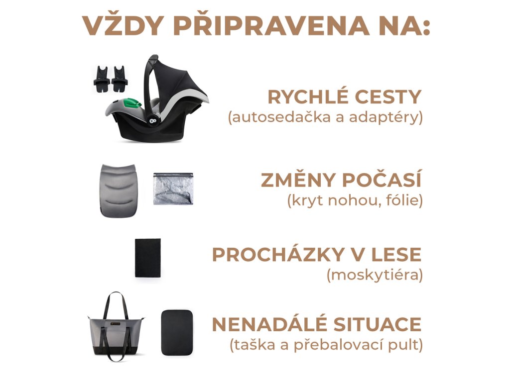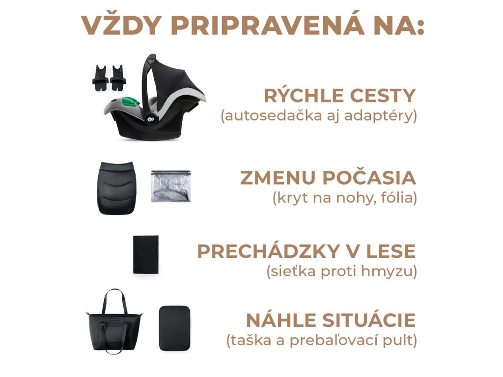 **A babakocsi praktikus tartozékokkal van felszerelve: elegáns táska utazó pelenkázó alátéttel, esővédő, szúnyogháló, babaülés adapterekkel, mózeskosár matrac, lábzsák (a sport babakocsihoz és a mózeskosárhoz is).**