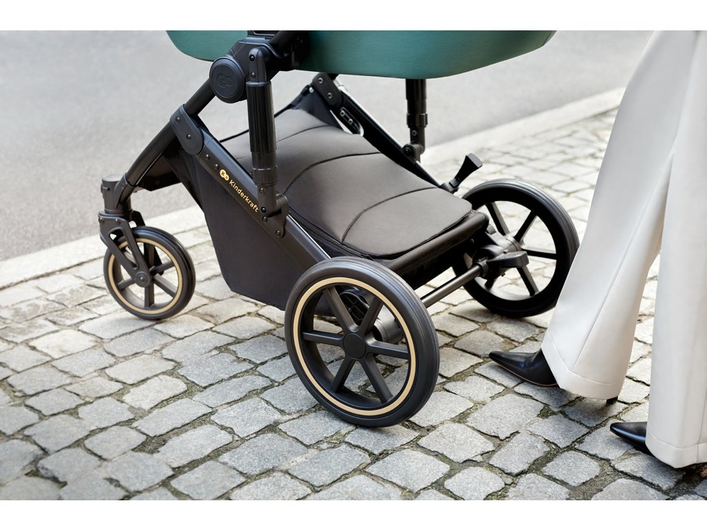 A PRIME 2 teljesen rugózott. Ez nemcsak a kerekekre, hanem a vázra is vonatkozik. A babakocsi jól megy a járdaszegélyeken, és a nagyméretű, defektálló kerekeknek köszönhetően a PRIME 2 nemcsak a városi járdákon, hanem az erdei ösvényeken is biztonságos lesz. **A habszivaccsal töltött gumikerekek biztosítják, hogy a babakocsi jól elnyeli az ütéseket, és a sétához nem kell felfújni a kerekeket.**