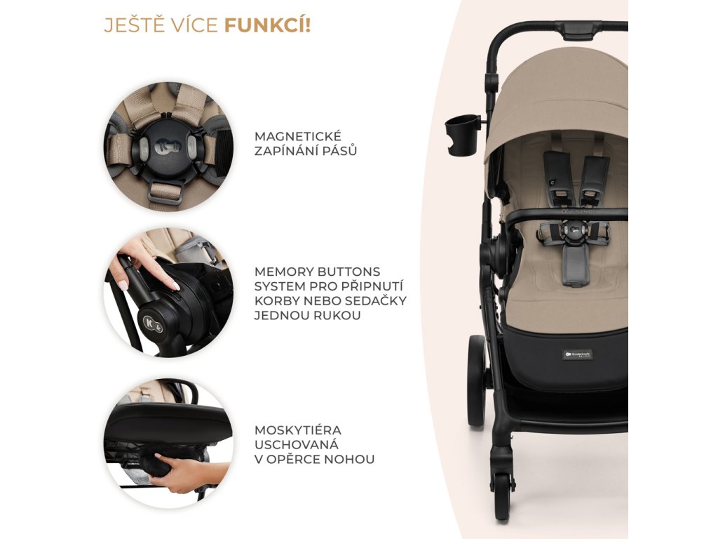 A MEMORY BUTTONS SYSTEM lehetővé teszi a sport babakocsi és a mózeskosár gyors leválasztását a vázról – mindezt egy kézzel. A mágneses csat megkönnyíti a gyermek babakocsiba való becsatolását. A mellékelt adapterek segítségével pedig TRAVEL SYSTEM-et hozhat létre, ha van gyermekülése.