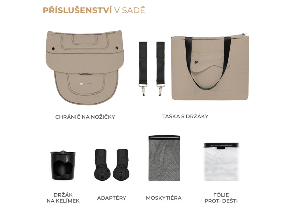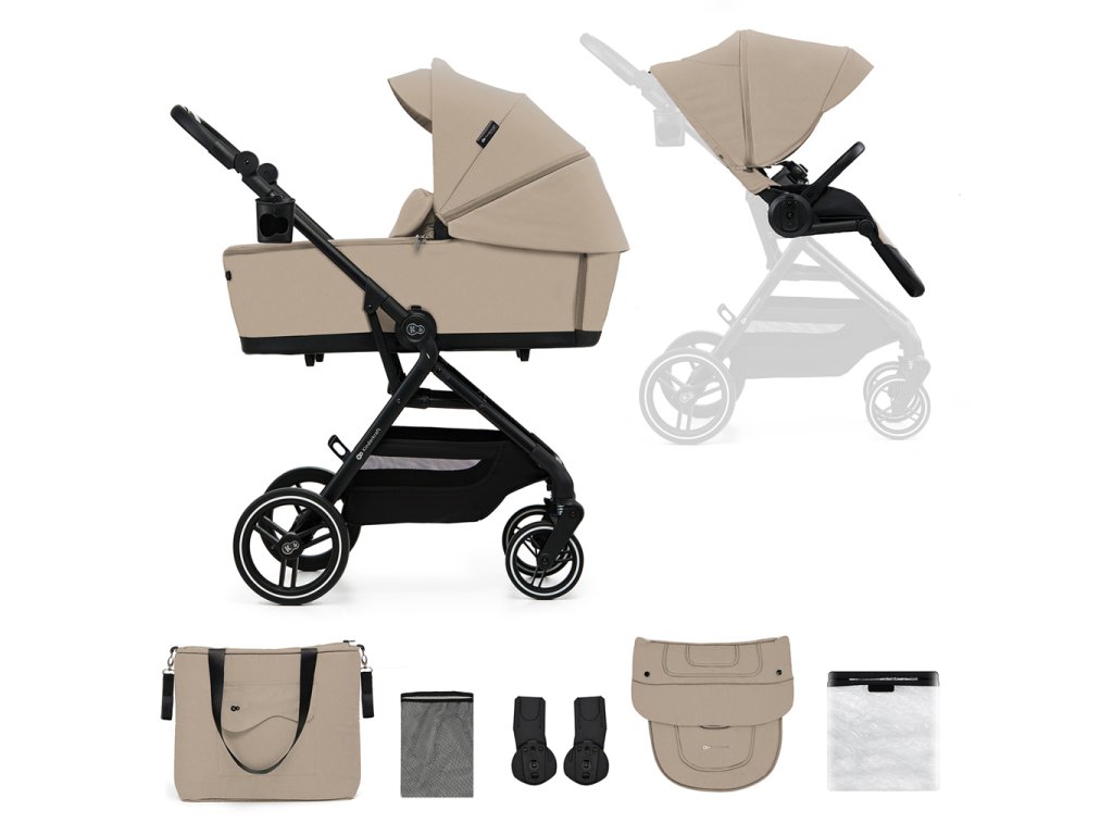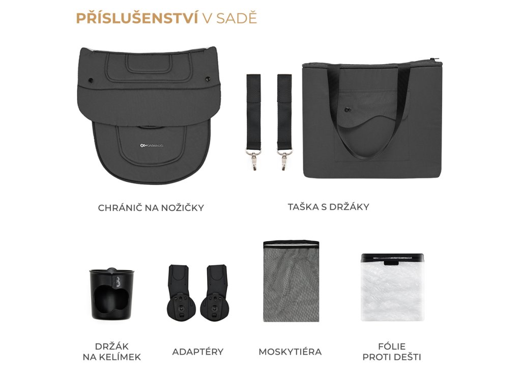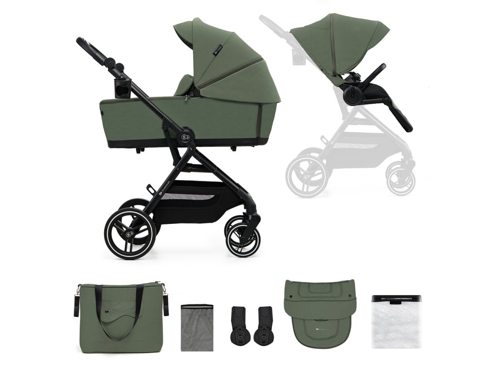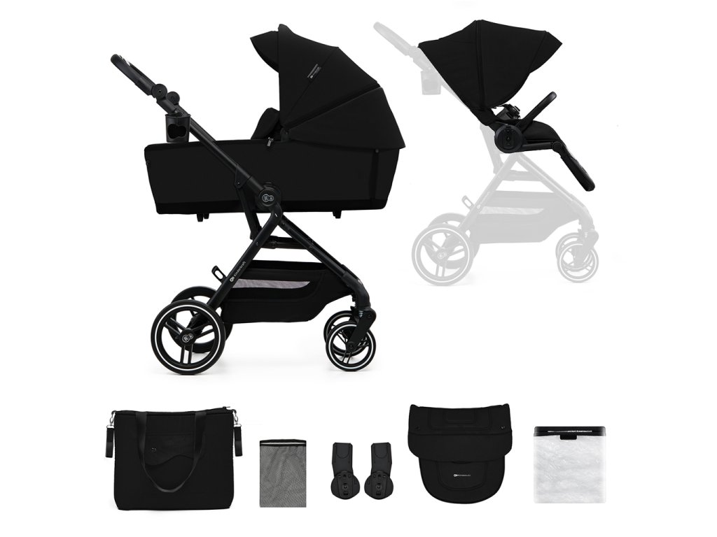 A nagyméretű, akár 5 kg teherbírású kosár minden szükséges dolgot elnyel. Egy plusz takaró és pelenkák? Vagy a hazafelé úton vásárolt dolgok? A mindkét oldalról könnyű hozzáférés lehetővé teszi, hogy gyorsan kivegyen bármit. A babakocsihoz tartozékok is tartoznak: szúnyogháló (a lábtartóban, amelyet mindig magánál tarthat), lábzsák, esővédő, pohártartó, szülőtáska és autósülés-adapterek.