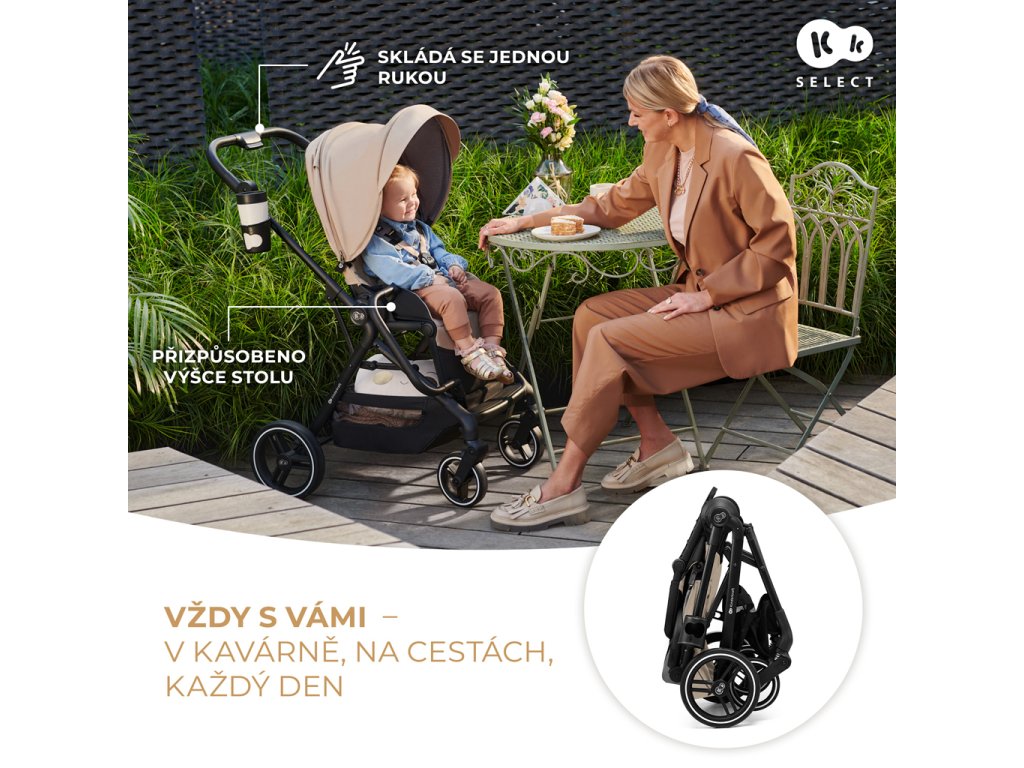 A YOXI ülés megfelelő magasságban van ahhoz, hogy a babakocsit az asztalhoz lehessen tolni. A babakocsi egy mozdulattal összecsukható – befelé csukódik, így a babakocsi anyaga szállítás közben nem szennyeződik.