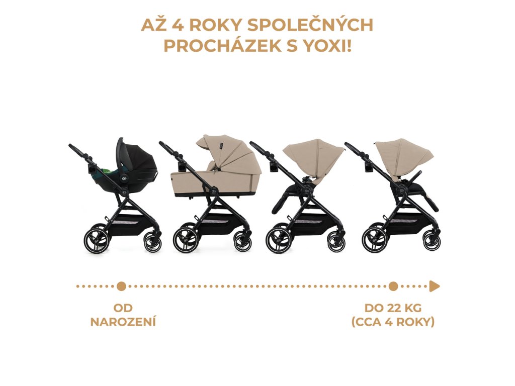 A YOXI 2 az 1-ben babakocsi újszülött kortól 22 kg-os súlyig ajánlott. Először mélykocsiként funkcionál tágas mózeskosárral, majd később kényelmes sport babakocsiként, amely menetiránnyal szemben vagy háttal is rögzíthető. A YOXI lehetővé teszi TRAVEL SYSTEM létrehozását.