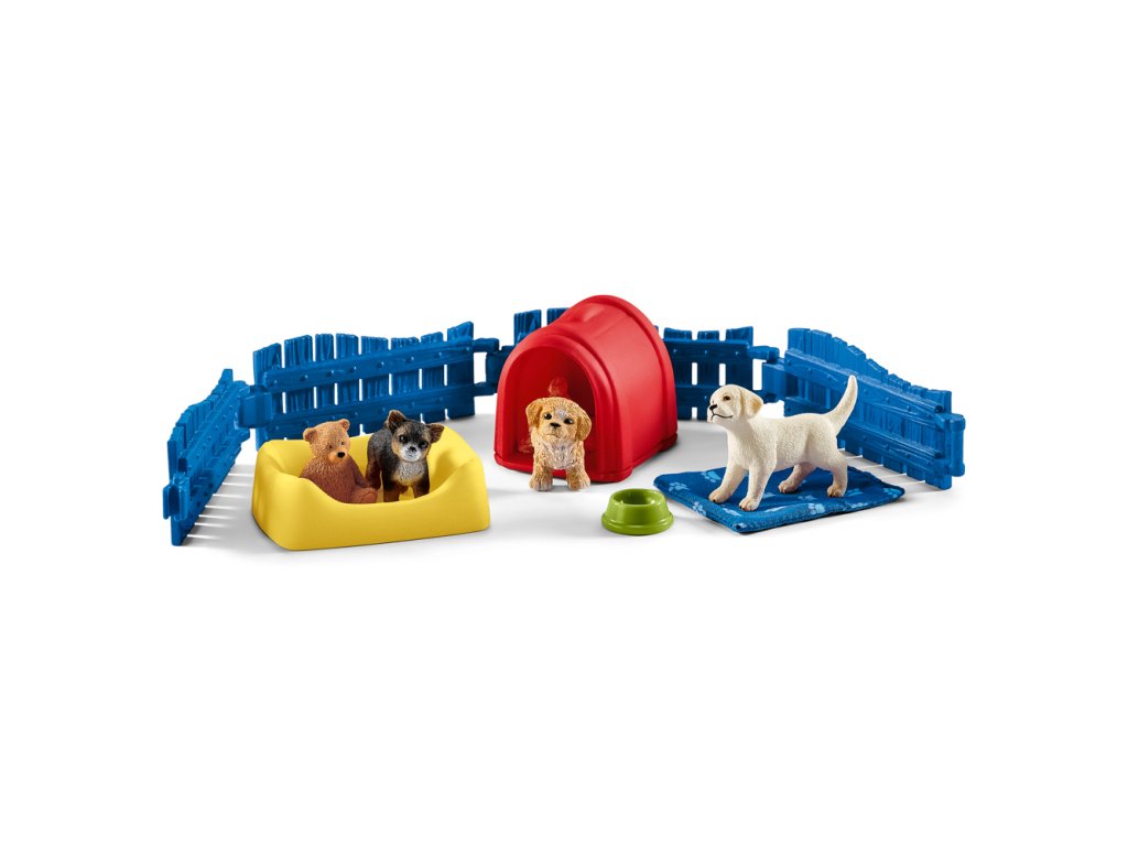 A kölyök szobában együtt játszik egy málta-pudli, egy csivava és egy labrador retriever. Mire képes ez a három együtt egy ilyen rakoncátlan rendetlenségben! Puha takarón játszanak, egy plüss mackón civakodnak, és bújócskát játszanak. Néha megérdemelten szundítanak a kutyafekhelyen. Érdekesség: Egy kis kerítés megakadályozza, hogy ez a három kíváncsi kölyökkutya elszökjön. Funkció: Tetszőlegesen csatlakoztatható kerítéselemek! A kerítés elemei kombinálhatók az összes Schleich® kerítéssel. Tartalom: 1 × máltai selyemkutya kölyök, 1 × csivava kölyök, 1 × labrador retriever kölyök, 1 × kutyaház, 1 × kutyafekhely, 1 × takaró, 1 × tál, 1 × plüss mackó, 5 × kerítés. Csomag mérete: 19 x 11,5 x 5,5 cm. A Schleich figurák rendkívül részletesek, szeretettel festettek, és lehetővé teszik a gyerekek számára, hogy játsszanak és tanuljanak. 3 éves kor alatti gyermekek számára nem alkalmas. Ajánlott életkor: 3-8