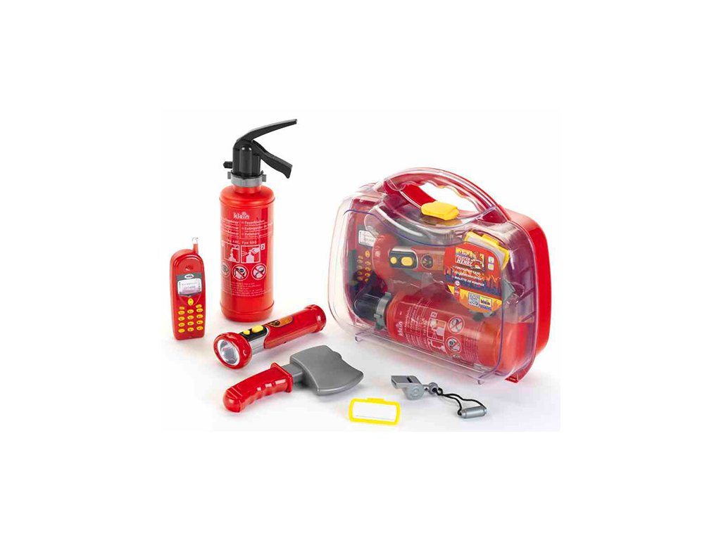 A tűzoltó bőrönd tartalma: 0,5 literes szórófejes oltókészülék, mobiltelefon, fejsze, névtábla, síp és zseblámpa.