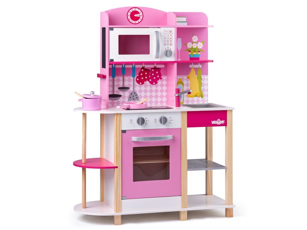 A termék tartalmazza az összes megjelenített tartozékot. Forgatható mosogató csapteleppel, nyitható ajtókkal és forgatható gombokkal rendelkezik az elektromos és a mikrohullámú sütőnél. Életkor: 3+. A termék mérete: 78 x 105 x 33,5 cm. A munkafelület magassága: 55 cm.