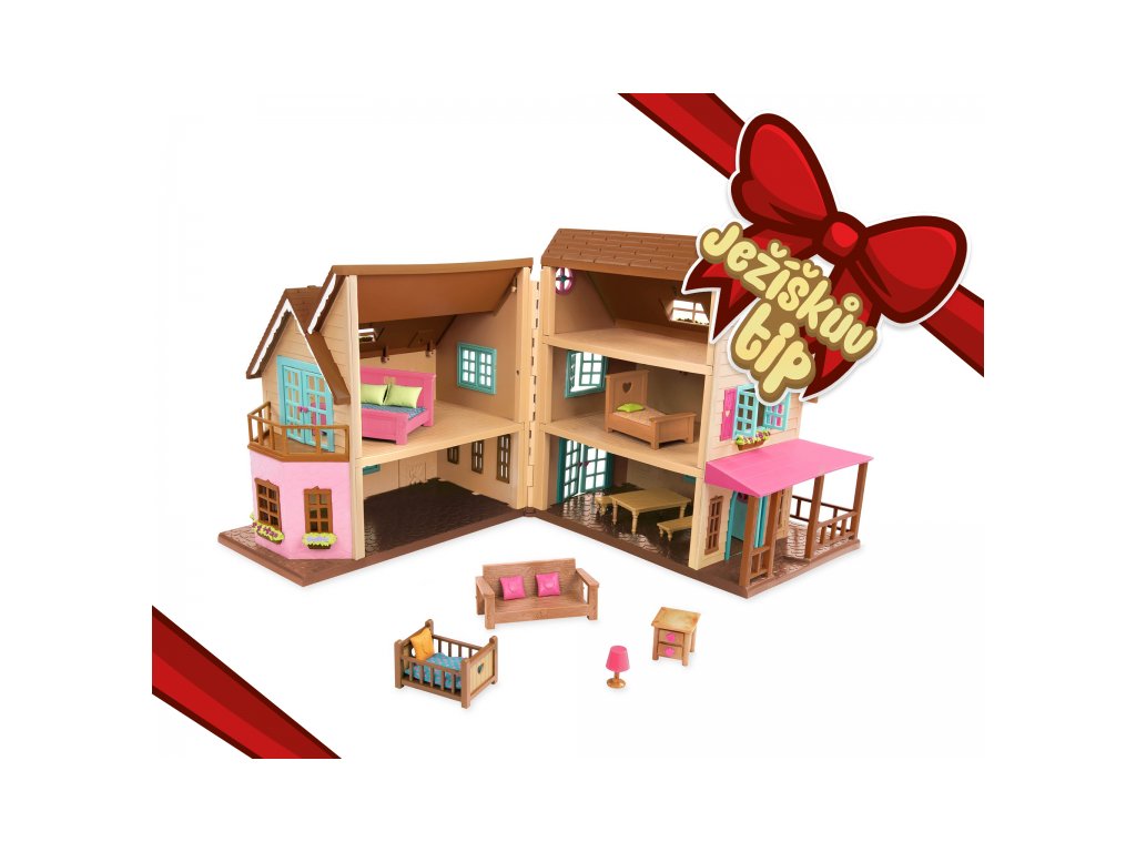A 20 darabos készlet tartalmaz egy házat működő lámpákkal, egy kanapét, 2 párnát, egy asztalt és 2 padot, egy ágyat matraccal és 2 párnával, egy kiságyat matraccal és párnával, egy kiságyat matraccal és párnával, egy éjjeliszekrényt.