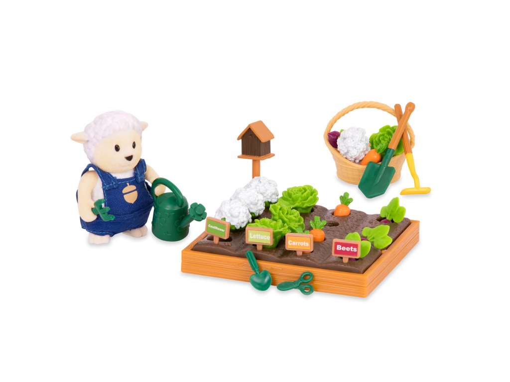 Ki ne szeretne saját kezűleg termesztett zöldséget! A kertészkészlet mindent tartalmaz, amire a Li'l Woodzeez állatkákának szüksége van a zöldségtermesztéshez – ágyást, palántákat és kerti szerszámokat is. És a madaraknak is van egy odú! A csomag része egy bárányfigura.