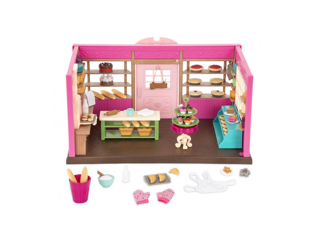 A 69 darabos készlet tartalmaz pékséget, mérőpoharat, lisztes zsákot, polcokat, állványt, kerek asztalt, 3 tányért, állványt 9 cupcake-kel, 2 süteményt, 3 szelet tortát, 6 tortát, 2 üveg tejet, keverőedényt, tálcákat 6 sütivel, croissant tálcát 3 croissant-nal, baguette kosarat 5 baguette-tel, sodrófát, tésztagombócot kivágott darabbal, süteményszaggatókat, mézeskalácsot, 5 vekni kenyeret, 5 bagelet, táblát kettőnek. Az állatfigurák nem részei a csomagolásnak, külön kaphatók.
