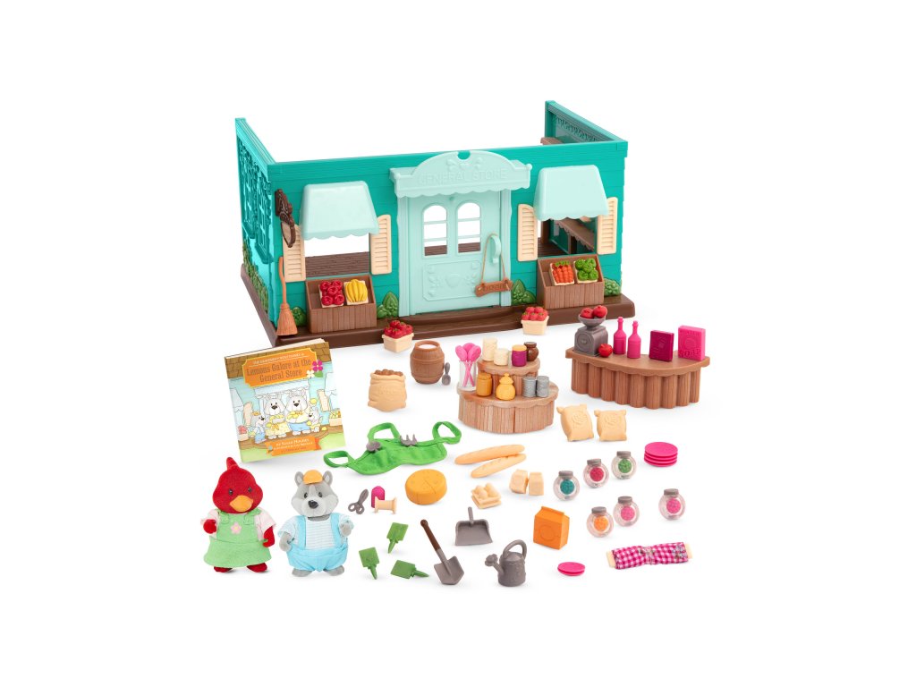 A vegyesboltban a Honeysuckle Hollow kisváros minden családtagja kiválaszthatja, amire szüksége van – kínálatunkban megtalálhatók a háztartási és kertészeti termékek, de például rágógumi és cukorka is! Az állatfigurák – Miles a farkas és Lolla a bíboros – szívesen adnak tanácsot minden vásárlónak, és rendet tartanak az üzletben!