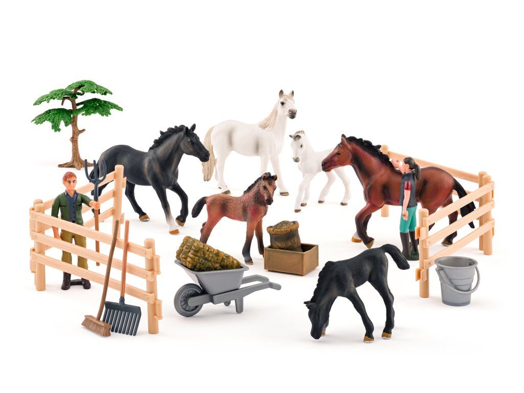 Gyönyörű játékkészlet, amely tele van lovakkal! Találsz benne 3 felnőtt lovat és 3 csikót, 2 gondozót és rengeteg további kiegészítőt.| Életkor: 3+ | Ló mérete: 12 x 10 cm