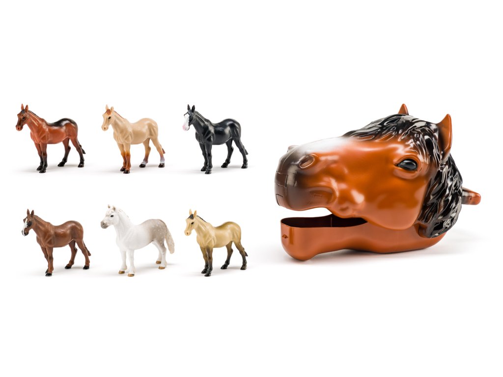 Induljon el a tanyára egy csodálatos lófejjel, amely figurákat rejt minden kis lókedvelő számára. A lófej praktikus tárolódobozként szolgál – minden figurát tárol, és a fogantyúnak köszönhetően a gyerekek könnyen bárhová magukkal vihetik. Csak meg kell nyomni az orr alatti gombot, és a pofa kinyílik – kezdődhet a játék! A kattintós rendszernek köszönhetően a pofa több szögben is nyitható. Belül hat különböző színű ló található. Az egész szett egy olyan nyitott dobozban van csomagolva, amely belső legelőnyomattal rendelkezik, és a játék részeként vagy eredeti kiállítási dekorációként is használható. A készlet tartalma: 1x lófej, 1x fekete ló, 1x sötétbarna ló, 1x barna ló, 1x achaltekei ló, 1x bézs színű ló, 1x pej ló. Minőségi műanyagból készült. Fej méretei: 18,5 x 18 x 31 cm. Figurák méretei: 9 x 3 x 9,5 cm. Csomag méretei: 22 x 32 x 19 cm. 3 éves kor alatti gyermekek számára nem alkalmas. Életkor: 3+