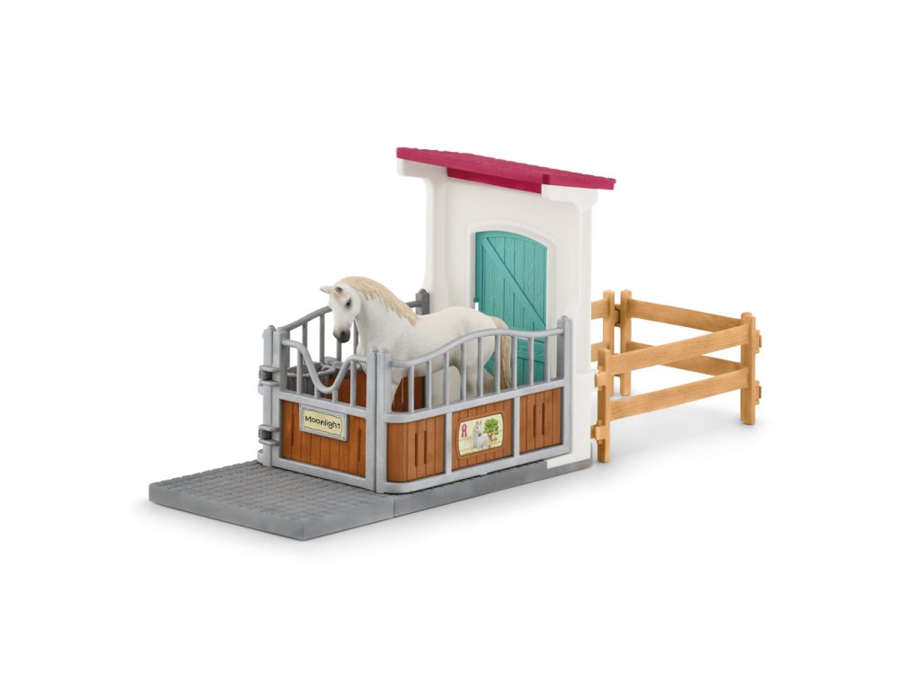 Miután minden lovaglás, ugrálás és rendrakás után minden ló pihenőre vágyik. A legjobb hely számukra a Schleich® HORSE CLUB kollekció hangulatos istállójában van. Mindent megtalálnak, amit egy ló szíve kíván: a takarmányvályúban ehetnek, és az itató még a legnagyobb lovat is megszomjazza. Már csak egy fagylaltgép hiányzik. Szerencsére a boxot hangulatod szerint zárhatod vagy nyitva hagyhatod. A lovak a legszívesebben nyitva hagyják, hogy megcsodálhassák bajnoki érmeiket. Valójában csak igazán különleges díjak vannak kiállítva. Különben nem maradna hely a lovaknak! Melyik szobában érzed magad a legjobban? A készlet tartalma: 1× angol telivér mén, 1× lófutár, 1× itató, 1× szénatartó, 2× hosszú kifutóelem, 1× rövid kifutóelem. Méretek: 18,7 x 24,5 x 8,3 cm. Életkor: 3+
