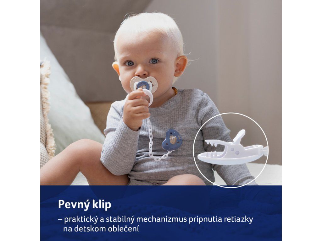 - Erős klipsz - a praktikus és tartós mechanizmus biztosítja a biztonságos rögzítést a baba ruházatán