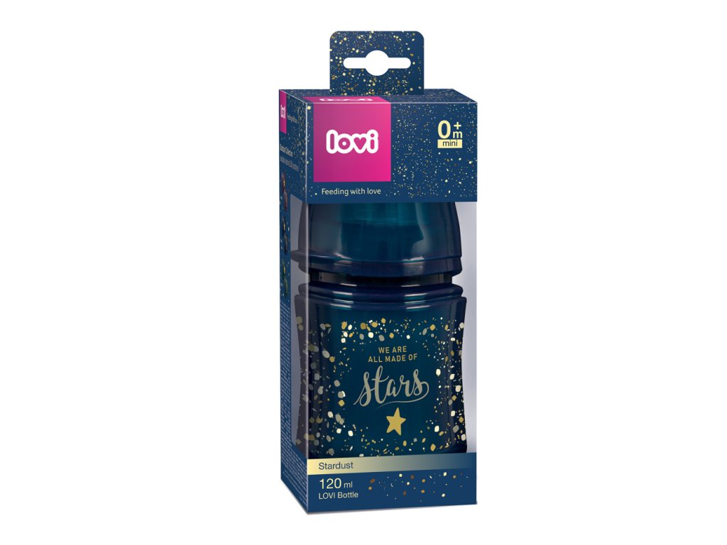 Itt a Stardust! Egyedi, dizájnos, prémium kollekció a LOVI-tól. A kollekció egy könnyű, 120 ml-es cumisüveggel büszkélkedik, dinamikus LOVI szilikon cumival, amely nem zavarja a baba szívóreflexét. A palack nem tartalmaz BPA-t. A Stardust kollekció egyedi dizájnja - arany csillogás formájában, amely a csillagos égre emlékeztet.