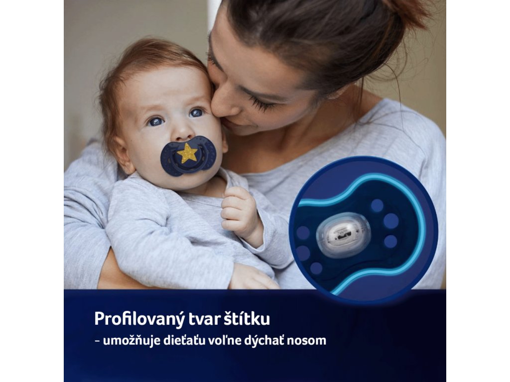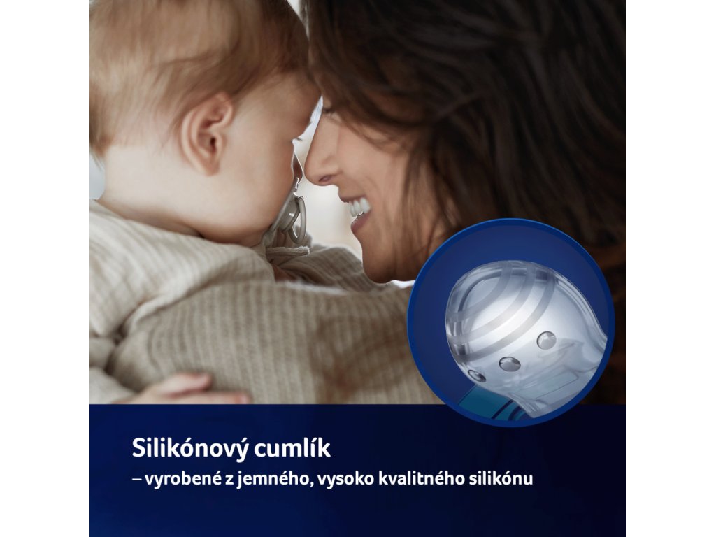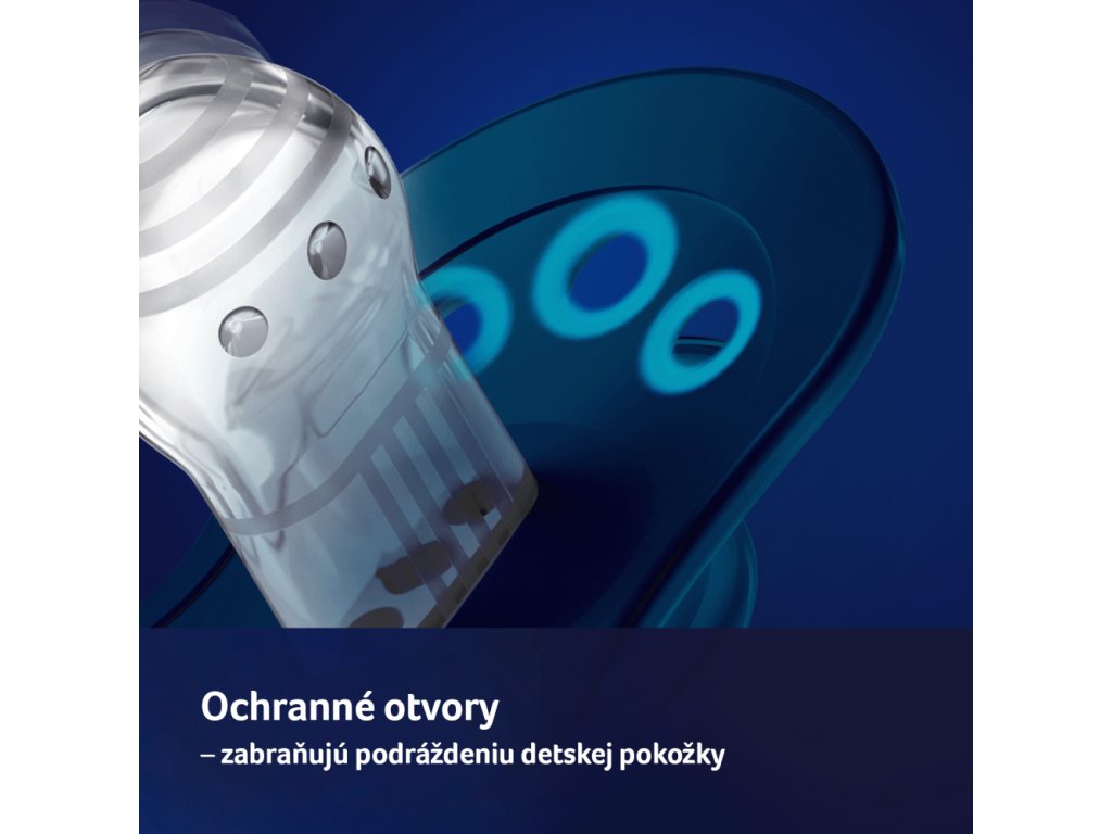 A formázott, kivágott pajzsforma lehetővé teszi a gyermek számára, hogy szabadon lélegezzen az orrán keresztül. Biztonságos anyagból készült, amely nem tartalmaz BPA-t. A pajzs egyedi széle egészségügyi anyagból készült, kellemes tapintású és megakadályozza a cumi benyomódását.
