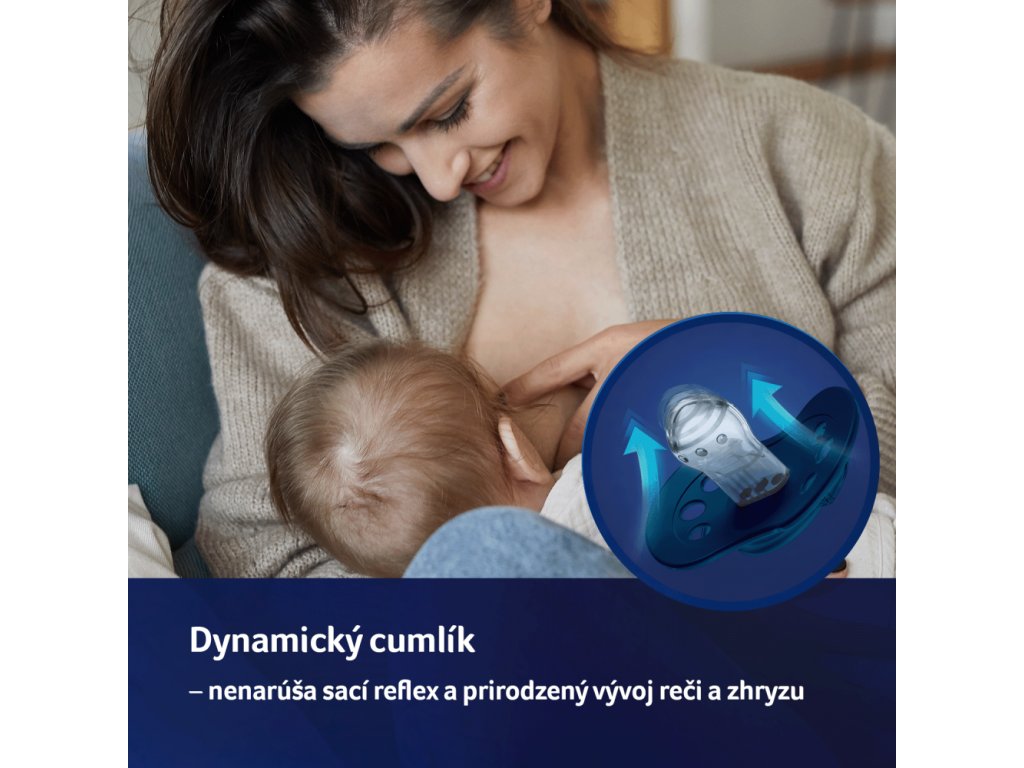 A dinamikus cumifej különböző szilikonrétegekből készül, így a gyermek szopási ritmusától függően nyúlik és zsugorodik. A szimmetrikus forma az anya mellbimbójára emlékeztet. A cumi alakja lehetővé teszi, hogy a cumit bármilyen módon a gyermek szájába helyezzék (nincs meghatározott felső és alsó oldala).