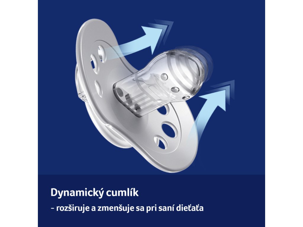 Egyenetlen szilikonrétegekből készült, így a baba szívásának ritmusától függően nyúlik és zsugorodik. A szimmetrikus forma az anya mellbimbójára emlékeztet. A cumi alakja lehetővé teszi, hogy a cumit bármilyen módon a gyermek szájába helyezzék (nincs meghatározott felső és alsó oldala).